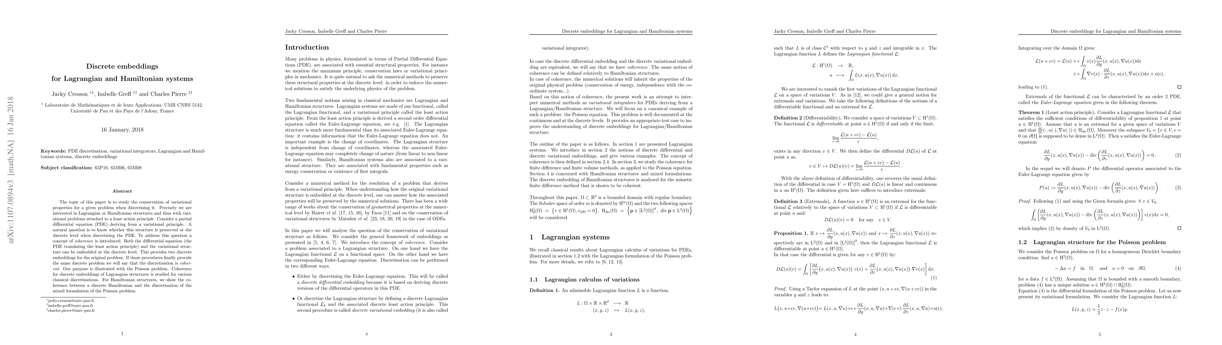 The general topic of the present paper is to study the conservation for some structural property of a given problem when discretising this problem. Precisely we are interested with Lagrangian or Hamiltonian structures and thus with variational problems attached to a least action principle. Considering a partial differential equation (PDE) deriving from such a variational principle, a natural question is to know whether this structure at the continuous level is preserved at the discrete level when discretising the PDE. To address this question a concept of \textit{coherence} is introduced. Both the differential equation (the PDE translating the least action principle) and the variational structure can be embedded at the discrete level. This provides two discrete embeddings for the original problem. In case these procedures finally provide the same discrete problem we will say that the discretisation is \textit{coherent}. Our purpose is illustrated with the Poisson problem. Coherence for discrete embeddings of Lagrangian structures is studied for various classical discretisations (finite elements, finite differences and finite volumes). Hamiltonian structures are shown to provide coherence between a discrete Hamiltonian structure and the discretisation of the mixed formulation of the PDE, both for mixed finite elements and mimetic finite differences methods.