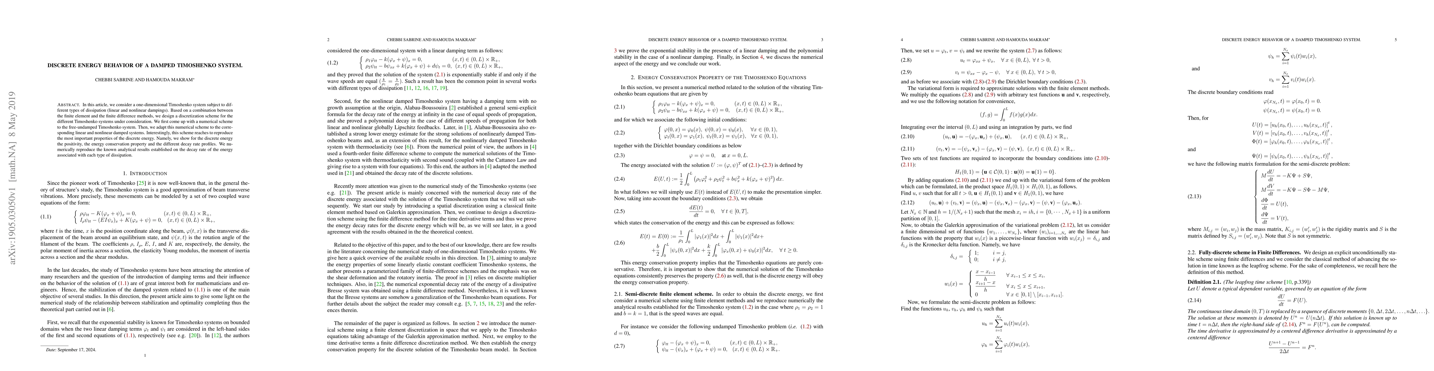 In this article, we consider a one-dimensional Timoshenko system subject to different types of dissipation (linear and nonlinear dampings). Based on a combination between the finite element and the finite difference methods, we design a discretization scheme for the different Timoshenko systems under consideration. We first come up with a numerical scheme to the free-undamped Timoshenko system. Then, we adapt this numerical scheme to the corresponding linear and nonlinear damped systems. Interestingly, this scheme reaches to reproduce the most important properties of the discrete energy. Namely, we show for the discrete energy the positivity, the energy conservation property and the different decay rate profiles. We numerically reproduce the known analytical results established on the decay rate of the energy associated with each type of dissipation.
