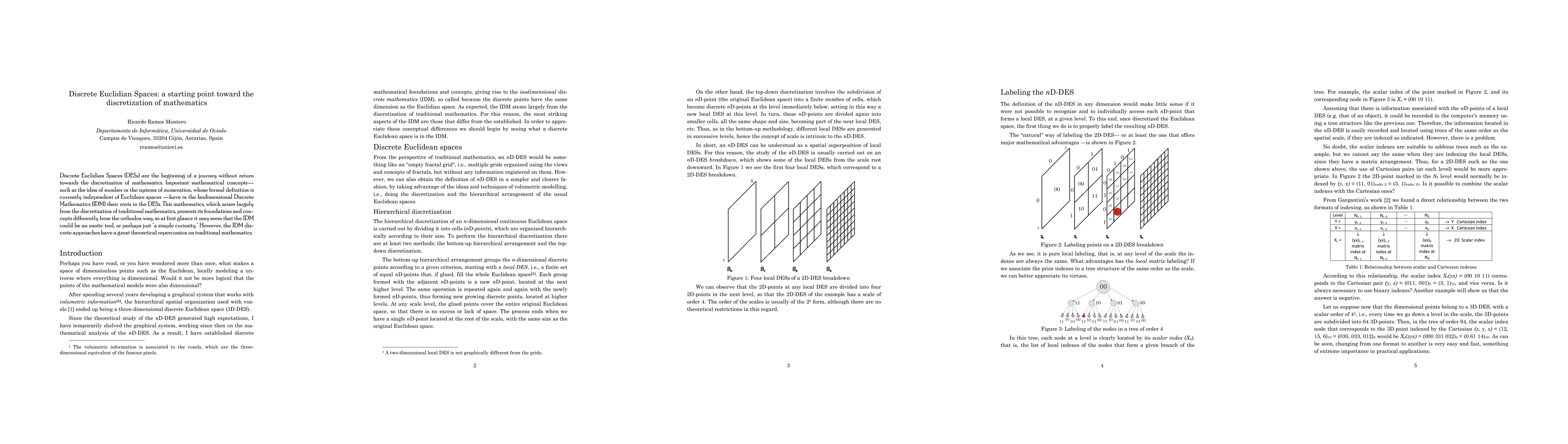 Discrete Euclidian Spaces (DESs) are the beginning of a journey without return towards the discretization of mathematics. Important mathematical concepts- such as the idea of number or the systems of numeration, whose formal definition is currently independent of Euclidean spaces -have in the Isodimensional Discrete Mathematics (IDM) their roots in the DESs. This mathematics, which arises largely from the discretization of traditional mathematics, presents its foundations and concepts differently from the orthodox way, so at first glance it may seem that the IDM could be an exotic tool, or perhaps just "a simple curiosity." However, the IDM dis-crete approaches have a great theoretical repercussion on traditional mathematics.