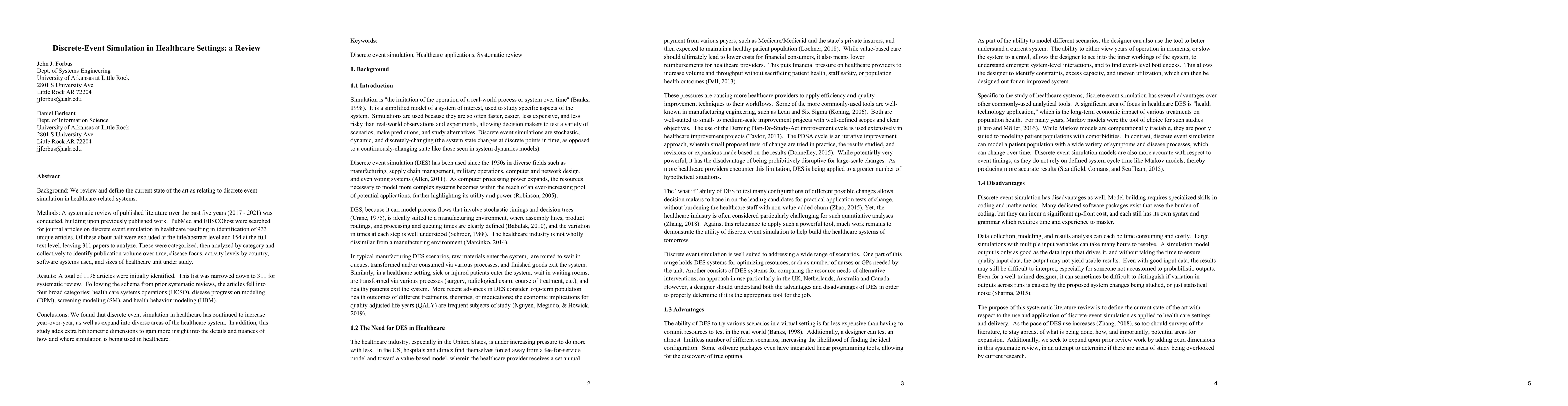 This paper reviews the state of discrete-event simulation in healthcare, analyzing 311 articles from 2017-2021. It categorizes usage across health systems, disease modeling, screening, and health behavior, noting an increase in publication volume and expansion into diverse healthcare areas.