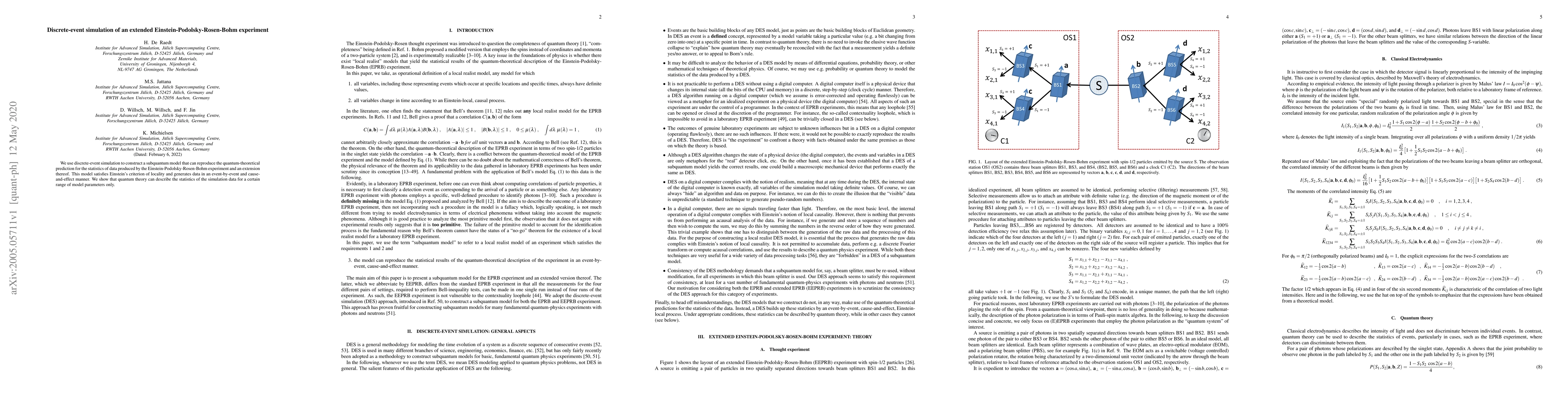 This paper employs discrete-event simulation to develop a subquantum model that mimics the quantum predictions for the Einstein-Podolsky-Rosen-Bohm experiment and its extensions, adhering to locality principles. The study reveals that quantum theory accurately describes the simulation data only within specific parameter ranges.