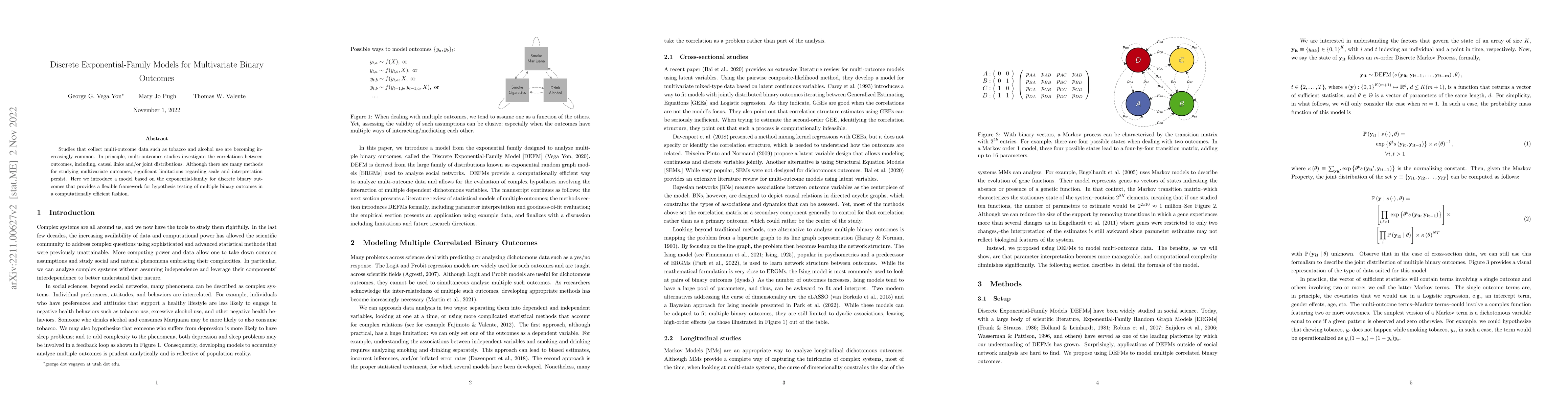 Studies that collect multi-outcome data such as tobacco and alcohol use are becoming increasingly common. In principle, multi-outcomes studies investigate the correlations between outcomes, including, causal links and/or joint distributions. Although there are many methods for studying multivariate outcomes, significant limitations regarding scale and interpretation persist. Here we introduce a model based on the exponential-family for discrete binary outcomes that provides a flexible framework for hypothesis testing of multiple binary outcomes in a computationally efficient fashion.