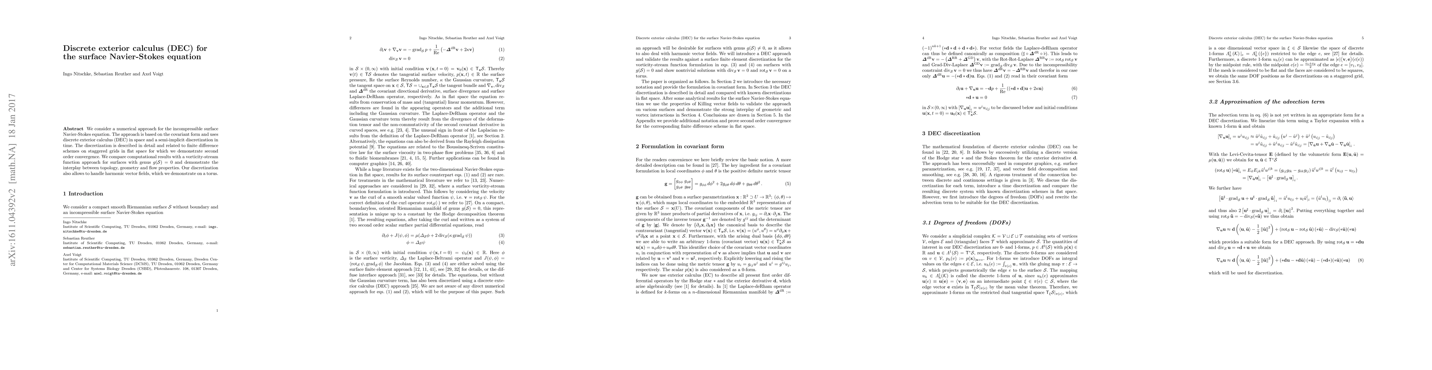This paper proposes a numerical method for solving the incompressible surface Navier-Stokes equation using discrete exterior calculus (DEC) and semi-implicit time discretization. The method demonstrates second-order convergence and is compared to a vorticity-stream function approach, highlighting the interplay between topology, geometry, and flow properties.