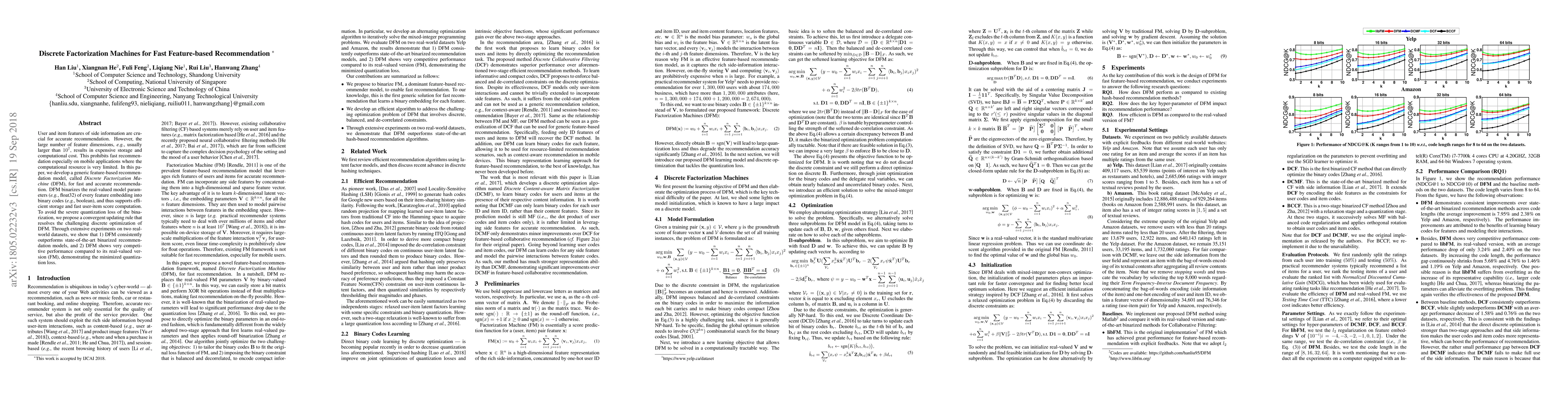 A new recommendation model called Discrete Factorization Machine (DFM) is proposed for fast and accurate feature-based recommendations, outperforming state-of-the-art models while minimizing computational cost.