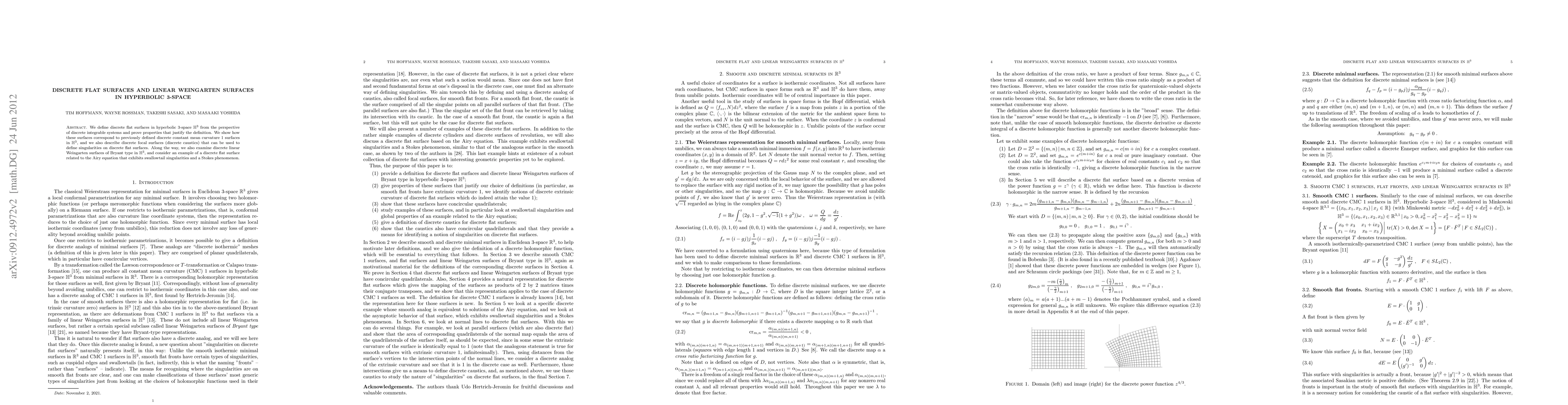 This paper defines discrete flat surfaces in hyperbolic 3-space through discrete integrable systems and relates them to discrete constant mean curvature 1 surfaces. It also explores discrete linear Weingarten surfaces of Bryant type, including an example showing swallowtail singularities and a Stokes phenomenon.