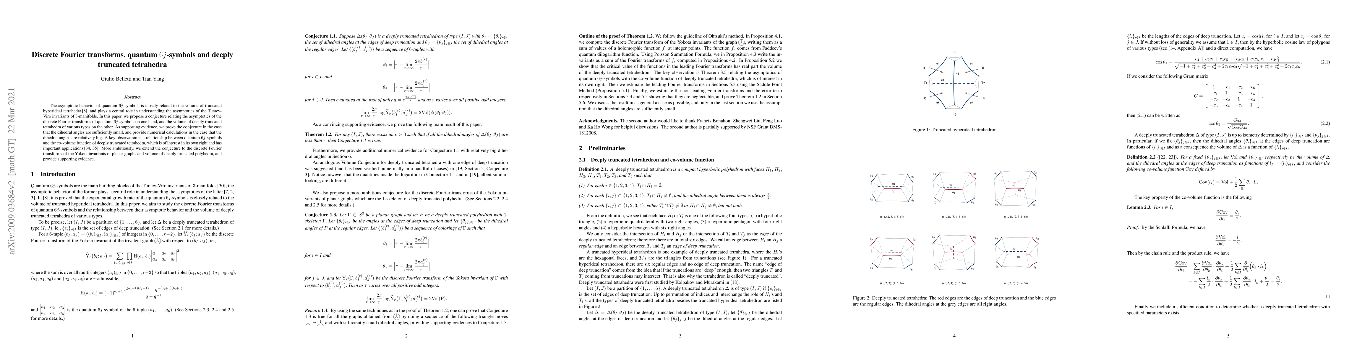 The asymptotic behavior of quantum $6j$-symbols is closely related to the volume of truncated hyperideal tetrahedra\,\cite{C}, and plays a central role in understanding the asymptotics of the Turaev-Viro invariants of $3$-manifolds. In this paper, we propose a conjecture relating the asymptotics of the discrete Fourier transforms of quantum $6j$-symbols on one hand, and the volume of deeply truncated tetrahedra of various types on the other. As supporting evidence, we prove the conjecture in the case that the dihedral angles are sufficiently small, and provide numerical calculations in the case that the dihedral angles are relatively big. A key observation is a relationship between quantum $6j$-symbols and the co-volume function of deeply truncated tetrahedra, which is of interest in its own right. More ambitiously, we extend the conjecture to the discrete Fourier transforms of the Yokota invariants of planar graphs and volume of deeply truncated polyhedra, and provide supporting evidence.
