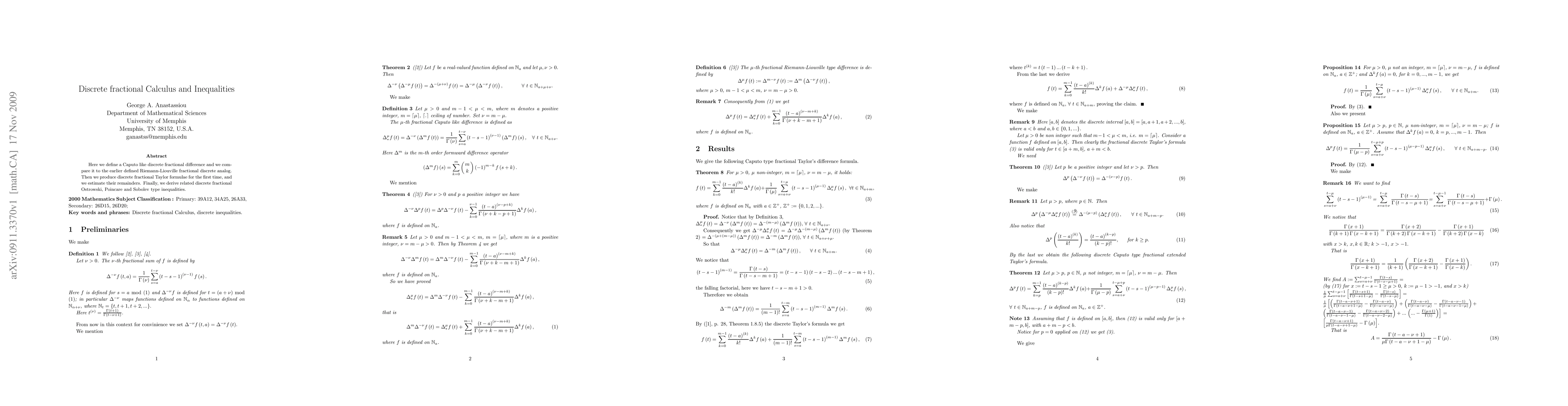 Here we define a Caputo like discrete fractional difference and we compare it to the earlier defined Riemann-Liouville fractional discrete analog. Then we produce discrete fractional Taylor formulae for the first time, and we estimate their remainders. Finally, we derive related discrete fractional Ostrowski, Poincare and Sobolev type inequalities.