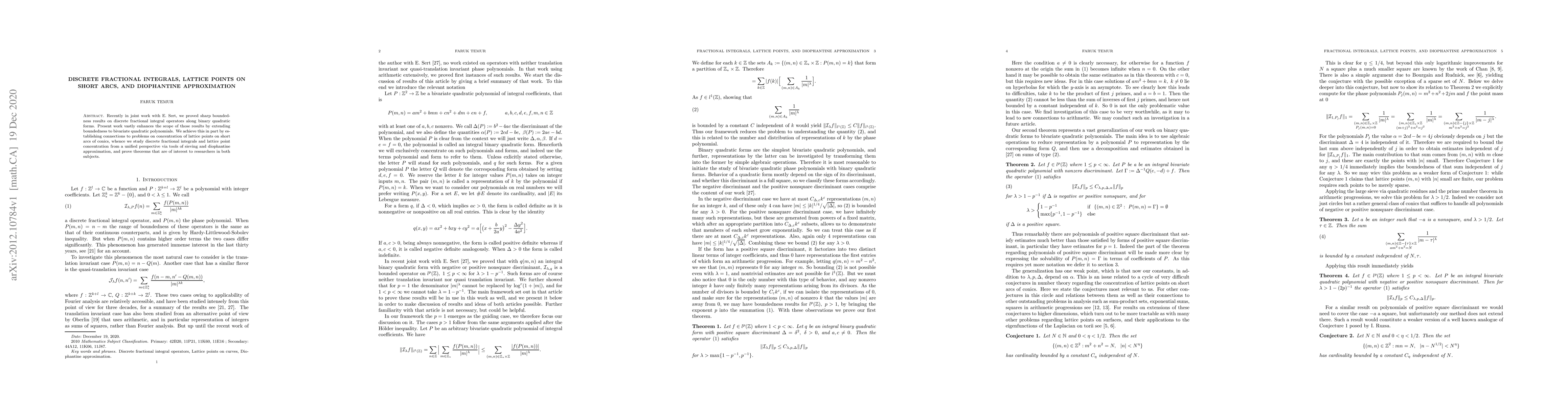 This paper extends sharp boundedness results for discrete fractional integral operators to bivariate quadratic polynomials, leveraging connections to lattice point concentration on short arcs of conics. The study unifies discrete fractional integrals and lattice point problems using sieving techniques and diophantine approximation, benefiting researchers in both fields.