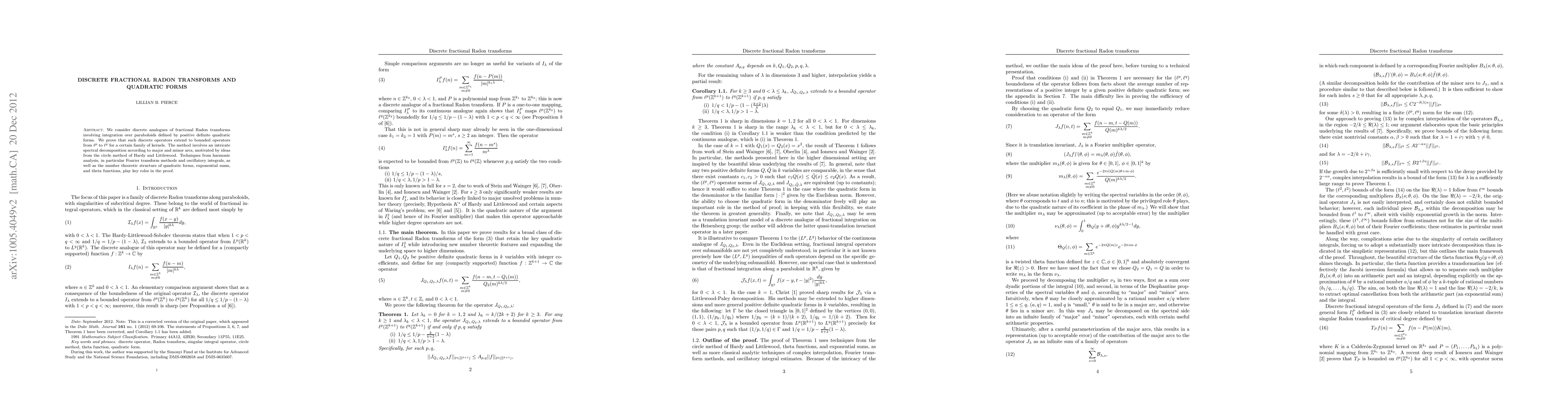 We consider discrete analogues of fractional Radon transforms involving integration over paraboloids defined by positive definite quadratic forms. We prove that such discrete operators extend to bounded operators from $\ell^p$ to $\ell^q$ for a certain family of kernels. The method involves an intricate spectral decomposition according to major and minor arcs, motivated by ideas from the circle method of Hardy and Littlewood. Techniques from harmonic analysis, in particular Fourier transform methods and oscillatory integrals, as well as the number theoretic structure of quadratic forms, exponential sums, and theta functions, play key roles in the proof.