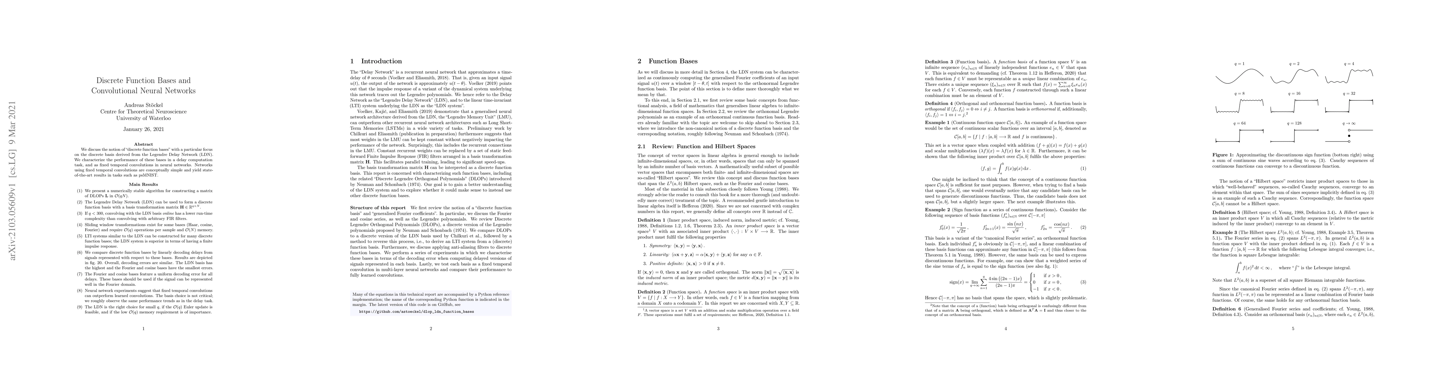 We discuss the notion of "discrete function bases" with a particular focus on the discrete basis derived from the Legendre Delay Network (LDN). We characterize the performance of these bases in a delay computation task, and as fixed temporal convolutions in neural networks. Networks using fixed temporal convolutions are conceptually simple and yield state-of-the-art results in tasks such as psMNIST. Main Results (1) We present a numerically stable algorithm for constructing a matrix of DLOPs L in O(qN) (2) The Legendre Delay Network (LDN) can be used to form a discrete function basis with a basis transformation matrix H in O(qN). (3) If q < 300, convolving with the LDN basis online has a lower run-time complexity than convolving with arbitrary FIR filters. (4) Sliding window transformations exist for some bases (Haar, cosine, Fourier) and require O(q) operations per sample and O(N) memory. (5) LTI systems similar to the LDN can be constructed for many discrete function bases; the LDN system is superior in terms of having a finite impulse response. (6) We compare discrete function bases by linearly decoding delays from signals represented with respect to these bases. Results are depicted in Figure 20. Overall, decoding errors are similar. The LDN basis has the highest and the Fourier and cosine bases have the smallest errors. (7) The Fourier and cosine bases feature a uniform decoding error for all delays. These bases should be used if the signal can be represented well in the Fourier domain. (8) Neural network experiments suggest that fixed temporal convolutions can outperform learned convolutions. The basis choice is not critical; we roughly observe the same performance trends as in the delay task. (9) The LDN is the right choice for small q, if the O(q) Euler update is feasible, and if the low O(q) memory requirement is of importance.