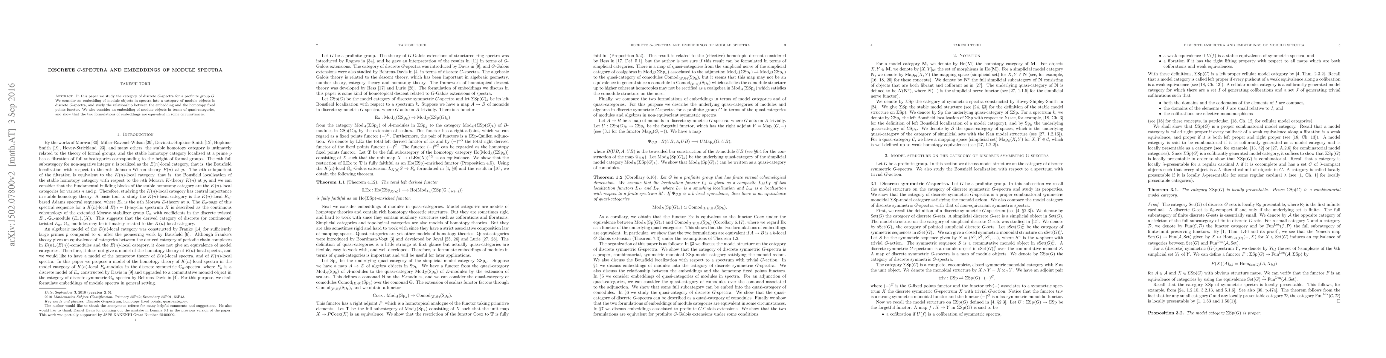 In this paper we study the category of discrete G-spectra for a profinite group G. We consider an embedding of module objects in spectra into a category of module objects in discrete G-spectra, and study the relationship between the embedding and the homotopy fixed points functor. We also consider an embedding of module objects in terms of quasi-categories, and show that the two formulations of embeddings are equivalent in some circumstances.
