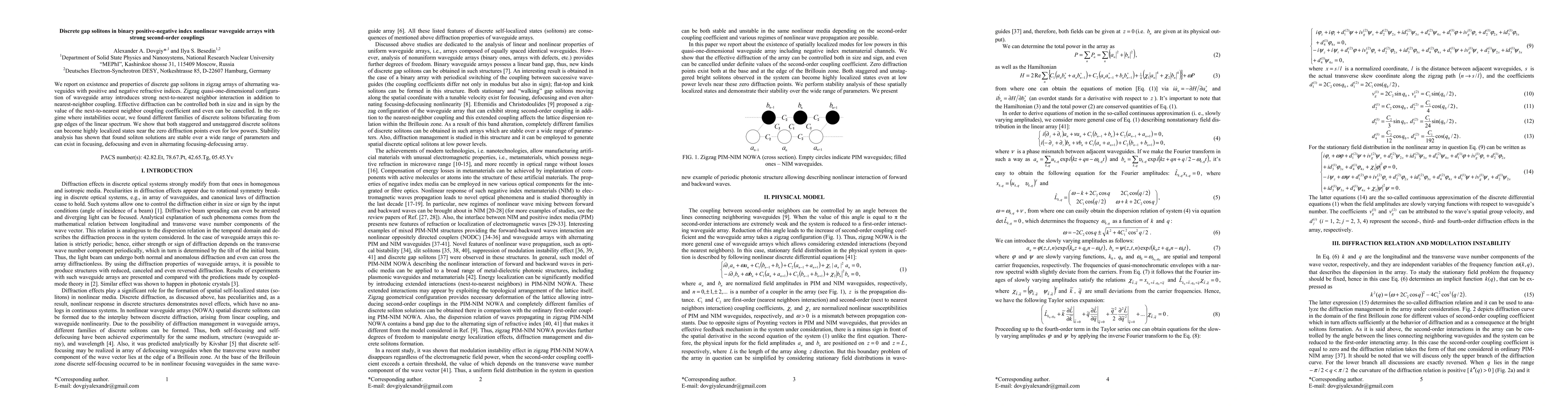 This paper investigates discrete gap solitons in zigzag waveguide arrays with alternating positive and negative refractive indices, revealing strong next-to-nearest neighbor interactions. The study finds various soliton families bifurcating from gap edges, demonstrating stability and localization even at low powers, applicable across different array configurations.