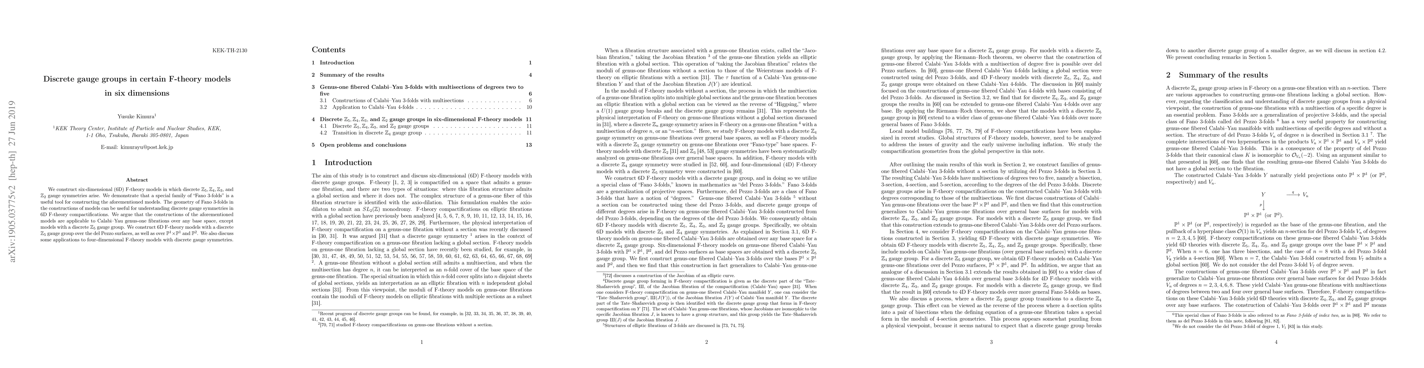 This paper constructs six-dimensional F-theory models featuring discrete gauge symmetries of $\mathbb{Z}_5$, $\mathbb{Z}_4$, $\mathbb{Z}_3$, and $\mathbb{Z}_2$. It utilizes "Fano 3-folds" to facilitate these constructions and highlights their relevance to understanding these symmetries in 6D compactifications.