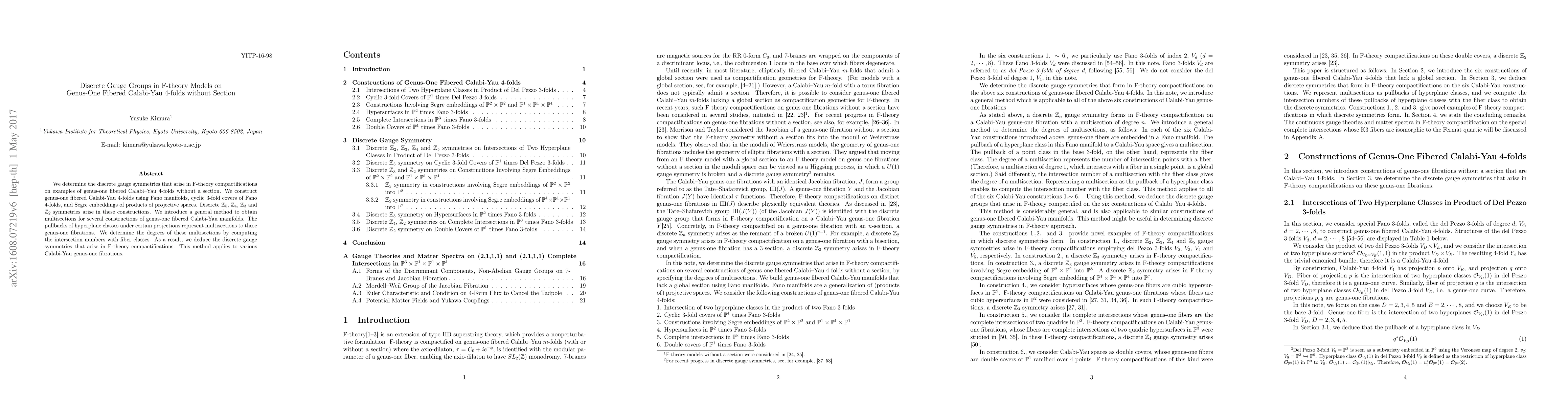 We determine the discrete gauge symmetries that arise in F-theory compactifications on examples of genus-one fibered Calabi-Yau 4-folds without a section. We construct genus-one fibered Calabi-Yau 4-folds using Fano manifolds, cyclic 3-fold covers of Fano 4-folds, and Segre embeddings of products of projective spaces. Discrete $\mathbb{Z}_5$, $\mathbb{Z}_4$, $\mathbb{Z}_3$ and $\mathbb{Z}_2$ symmetries arise in these constructions. We introduce a general method to obtain multisections for several constructions of genus-one fibered Calabi-Yau manifolds. The pullbacks of hyperplane classes under certain projections represent multisections to these genus-one fibrations. We determine the degrees of these multisections by computing the intersection numbers with fiber classes. As a result, we deduce the discrete gauge symmetries that arise in F-theory compactifications. This method applies to various Calabi-Yau genus-one fibrations.
