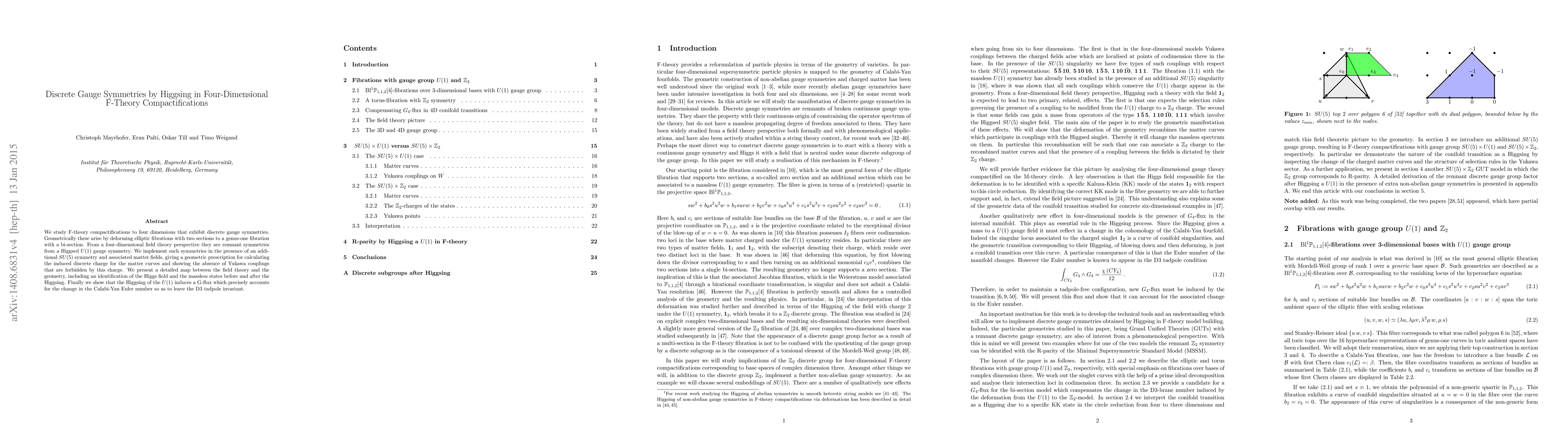 We study F-Theory compactifications to four dimensions that exhibit discrete gauge symmetries. Geometrically these arise by deforming elliptic fibrations with two sections to a genus-one fibration with a bi-section. From a four-dimensional field-theory perspective they are remnant symmetries from a Higgsed U(1) gauge symmetry. We implement such symmetries in the presence of an additional SU(5) symmetry and associated matter fields, giving a geometric prescription for calculating the induced discrete charge for the matter curves and showing the absence of Yukawa couplings that are forbidden by this charge. We present a detailed map between the field theory and the geometry, including an identification of the Higgs field and the massless states before and after the Higgsing. Finally we show that the Higgsing of the U(1) induces a G-flux which precisely accounts for the change in the Calabi-Yau Euler number so as to leave the D3 tadpole invariant.