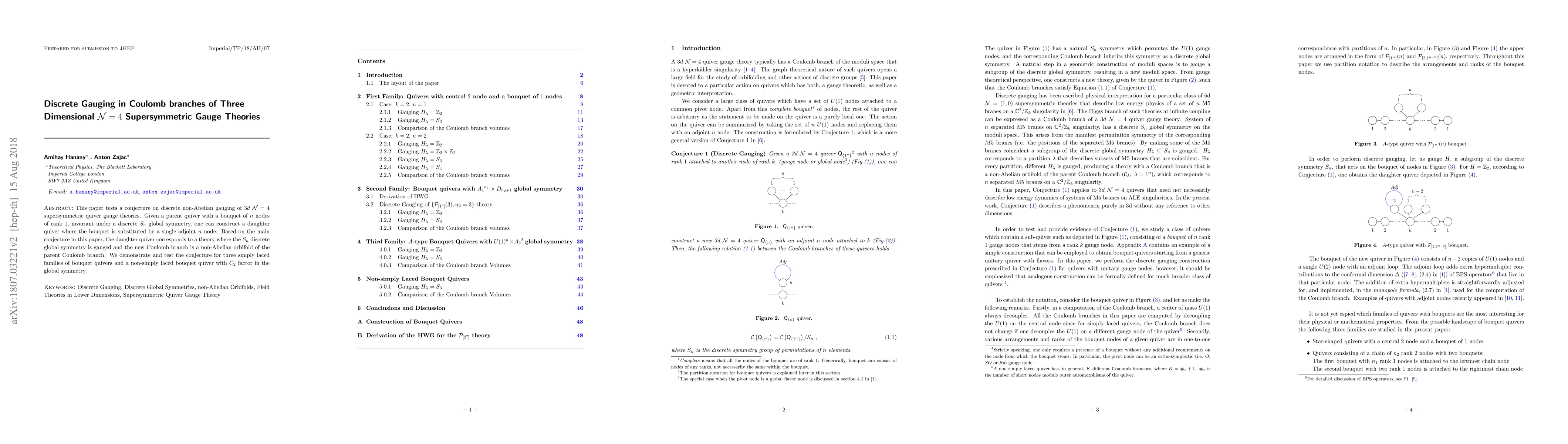This paper tests a conjecture on discrete non-Abelian gauging of 3d $\mathcal{N} = 4$ supersymmetric quiver gauge theories. Given a parent quiver with a bouquet of $n$ nodes of rank $1$, invariant under a discrete $S_n$ global symmetry, one can construct a daughter quiver where the bouquet is substituted by a single adjoint $n$ node. Based on the main conjecture in this paper, the daughter quiver corresponds to a theory where the $S_n$ discrete global symmetry is gauged and the new Coulomb branch is a non-Abelian orbifold of the parent Coulomb branch. We demonstrate and test the conjecture for three simply laced families of bouquet quivers and a non-simply laced bouquet quiver with $C_2$ factor in the global symmetry.
