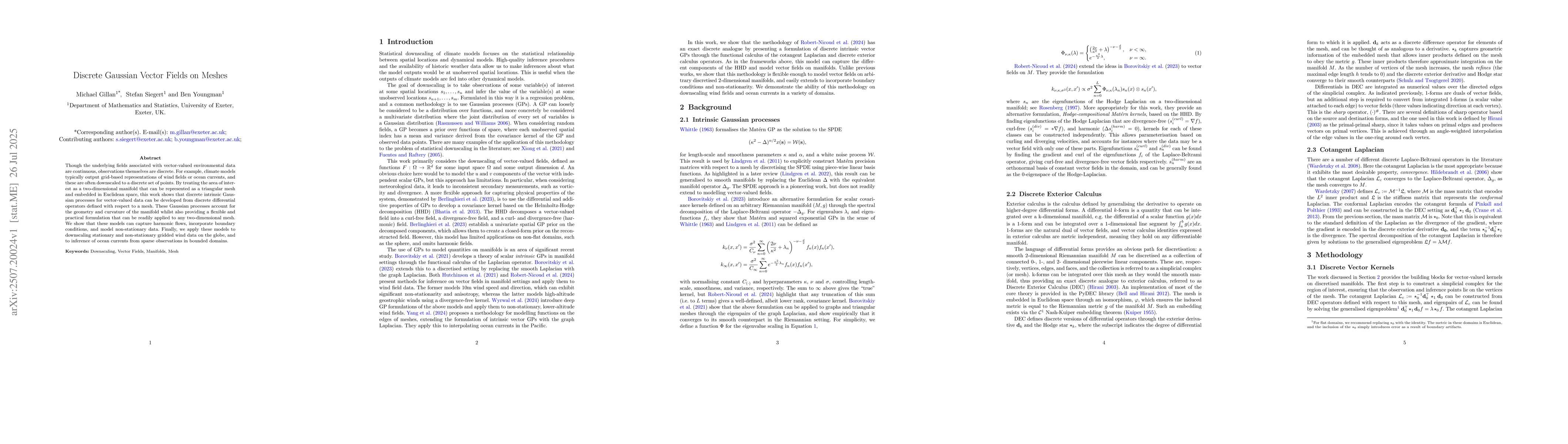 Though the underlying fields associated with vector-valued environmental data are continuous, observations themselves are discrete. For example, climate models typically output grid-based representations of wind fields or ocean currents, and these are often downscaled to a discrete set of points. By treating the area of interest as a two-dimensional manifold that can be represented as a triangular mesh and embedded in Euclidean space, this work shows that discrete intrinsic Gaussian processes for vector-valued data can be developed from discrete differential operators defined with respect to a mesh. These Gaussian processes account for the geometry and curvature of the manifold whilst also providing a flexible and practical formulation that can be readily applied to any two-dimensional mesh. We show that these models can capture harmonic flows, incorporate boundary conditions, and model non-stationary data. Finally, we apply these models to downscaling stationary and non-stationary gridded wind data on the globe, and to inference of ocean currents from sparse observations in bounded domains.