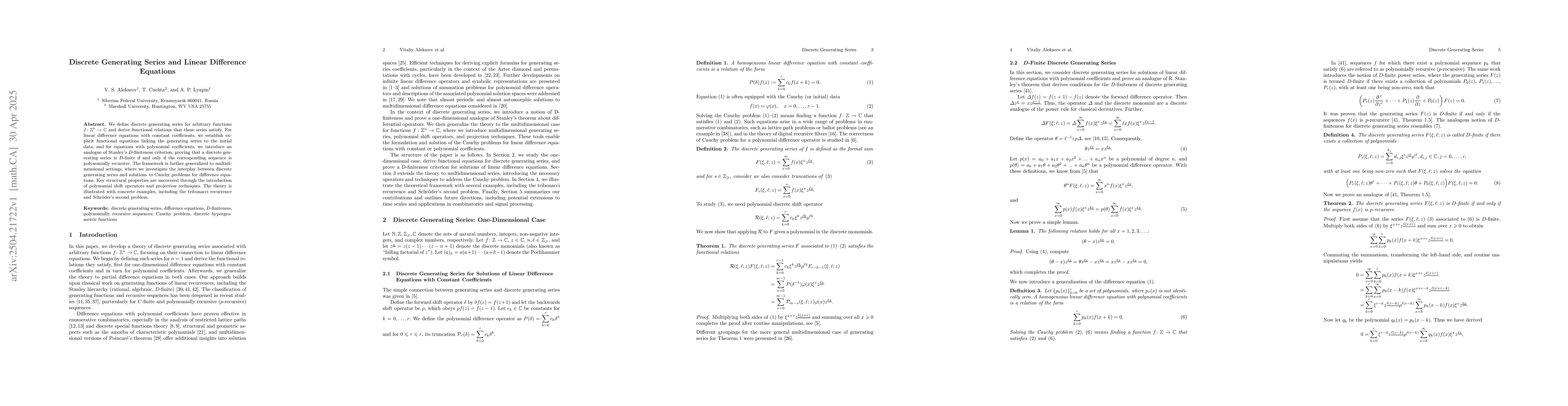 We define discrete generating series for arbitrary functions \( f \colon \mathbb{Z}^n \rightarrow \mathbb{C} \) and derive functional relations that these series satisfy. For linear difference equations with constant coefficients, we establish explicit functional equations linking the generating series to the initial data, and for equations with polynomial coefficients, we introduce an analogue of Stanley's \( D \)-finiteness criterion, proving that a discrete generating series is \( D \)-finite if and only if the corresponding sequence is polynomially recursive. The framework is further generalized to multidimensional settings, where we investigate the interplay between discrete generating series and solutions to Cauchy problems for difference equations. Key structural properties are uncovered through the introduction of polynomial shift operators and projection techniques. The theory is illustrated with concrete examples, including the Tribonacci recurrence and Schr\"oder's second problem.