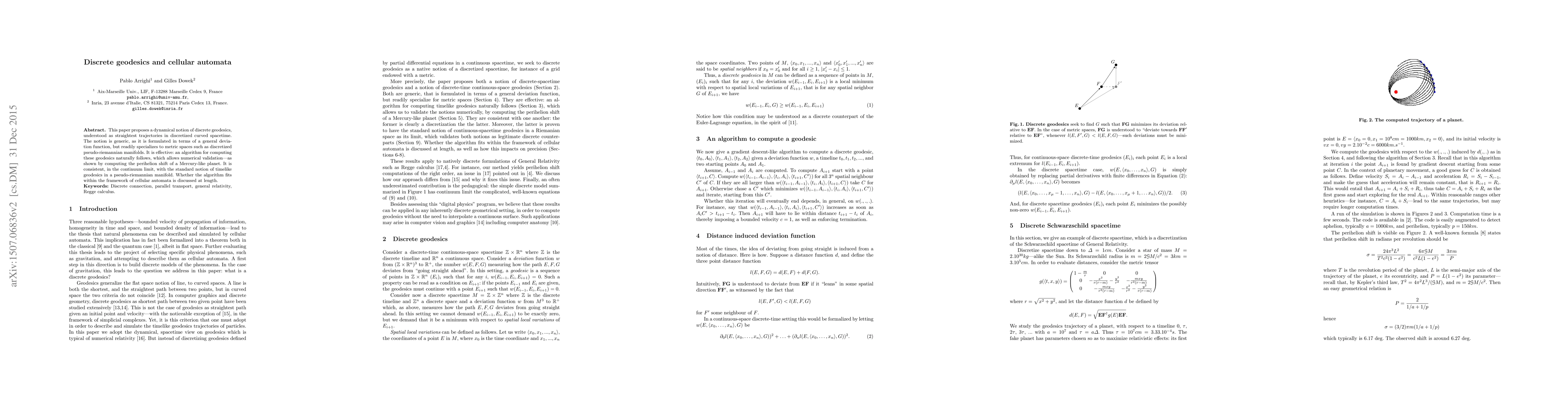 This paper introduces a concept of discrete geodesics in discretized curved spacetime, providing an algorithm for their computation and demonstrating consistency with standard timelike geodesics in the continuum limit. The paper also explores the potential fit of this algorithm within the framework of cellular automata.