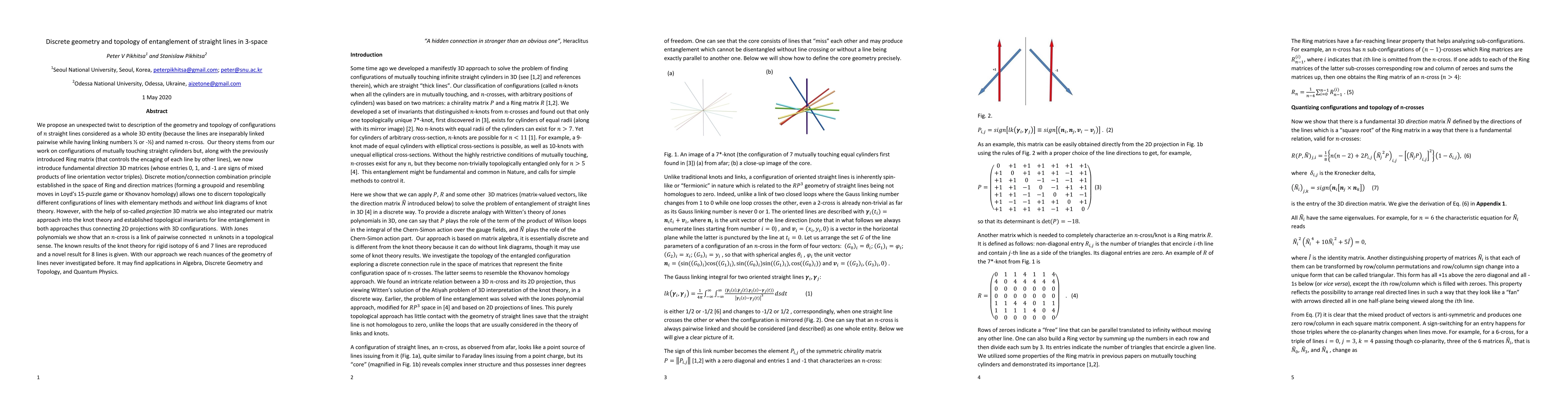 This paper introduces a novel framework for understanding the geometry and topology of configurations of n straight lines in 3D space, termed n-crosses, where lines are pairwise entangled. The authors combine Ring and direction matrices to analyze these configurations, establishing a discrete motion/connection principle that allows for the discernment of topologically distinct configurations without traditional knot theory.