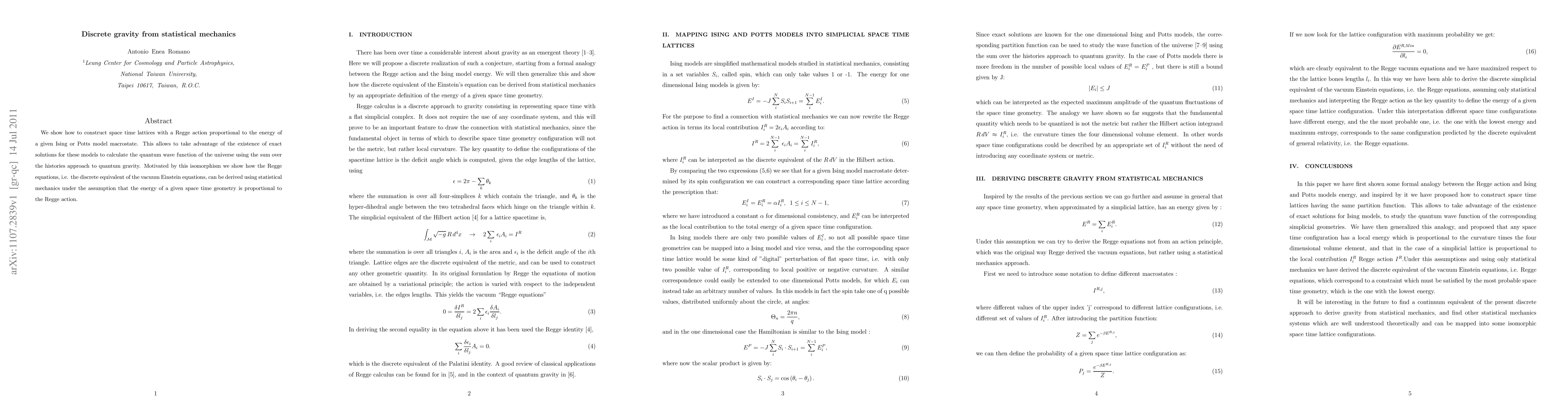 This paper constructs space-time lattices using a Regge action linked to the energy of Ising or Potts models, enabling the calculation of the universe's quantum wave function via exact statistical mechanics solutions. It demonstrates the derivation of the Regge equations, a discrete form of Einstein's equations, from statistical mechanics principles.