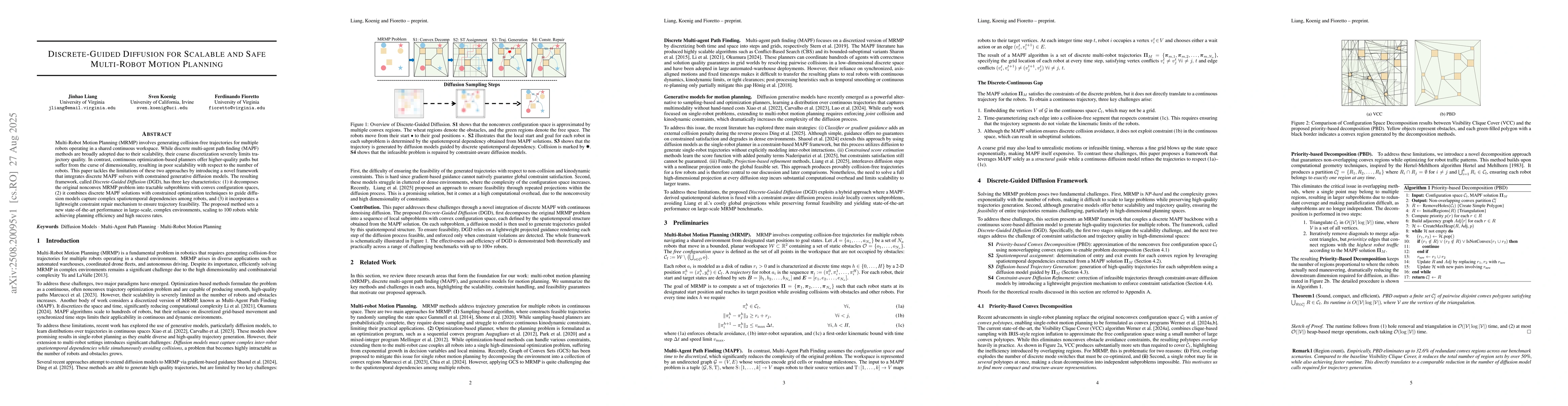 Multi-Robot Motion Planning (MRMP) involves generating collision-free trajectories for multiple robots operating in a shared continuous workspace. While discrete multi-agent path finding (MAPF) methods are broadly adopted due to their scalability, their coarse discretization severely limits trajectory quality. In contrast, continuous optimization-based planners offer higher-quality paths but suffer from the curse of dimensionality, resulting in poor scalability with respect to the number of robots. This paper tackles the limitations of these two approaches by introducing a novel framework that integrates discrete MAPF solvers with constrained generative diffusion models. The resulting framework, called Discrete-Guided Diffusion (DGD), has three key characteristics: (1) it decomposes the original nonconvex MRMP problem into tractable subproblems with convex configuration spaces, (2) it combines discrete MAPF solutions with constrained optimization techniques to guide diffusion models capture complex spatiotemporal dependencies among robots, and (3) it incorporates a lightweight constraint repair mechanism to ensure trajectory feasibility. The proposed method sets a new state-of-the-art performance in large-scale, complex environments, scaling to 100 robots while achieving planning efficiency and high success rates.
