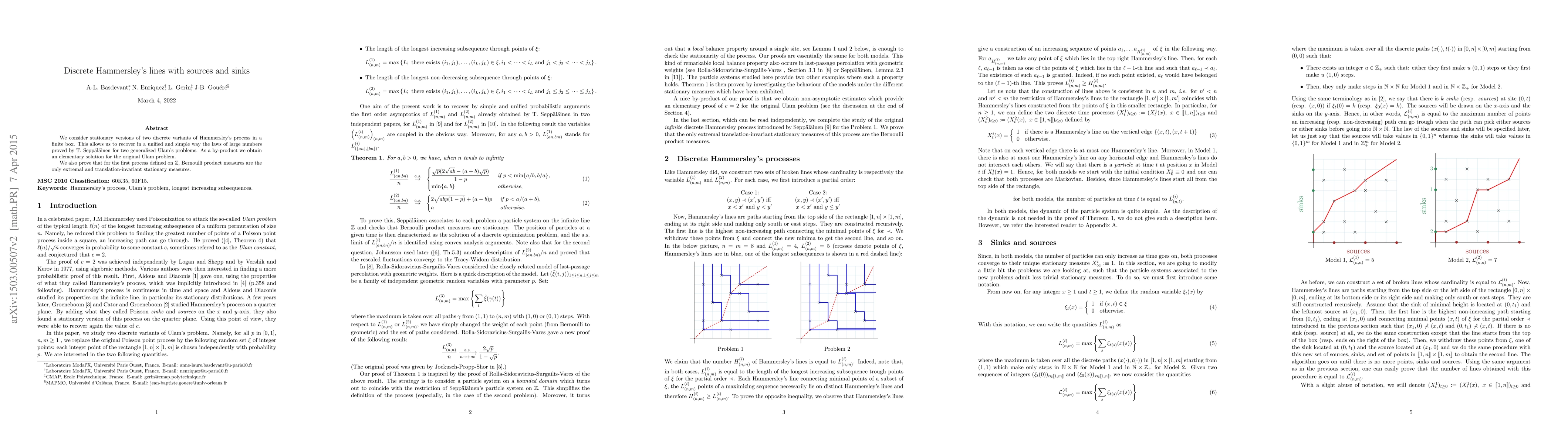 Summary: This paper presents two stationary versions of discrete Hammersley's processes, which unify and simplify the laws of large numbers for generalized Ulam's problems, and provides an elementary solution for the original Ulam problem. It also establishes that Bernoulli product measures are the only extremal and translation-invariant stationary measures for the first process defined on Z.