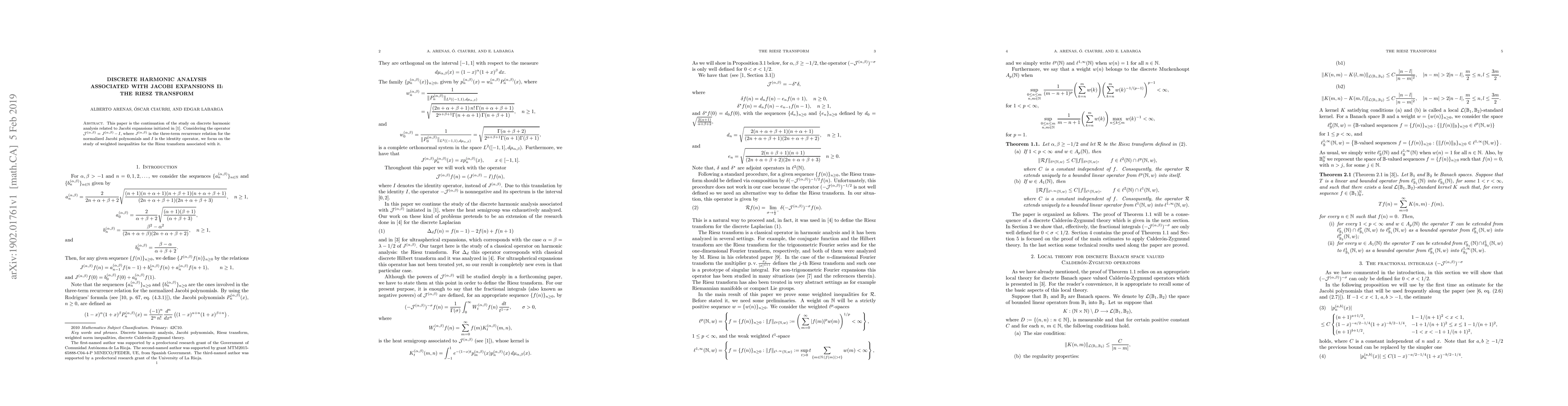 This paper continues the investigation into discrete harmonic analysis using Jacobi expansions, focusing on the operator $\mathcal{J}^{(\alpha,\beta)}$ and exploring weighted inequalities for the associated Riesz transform.