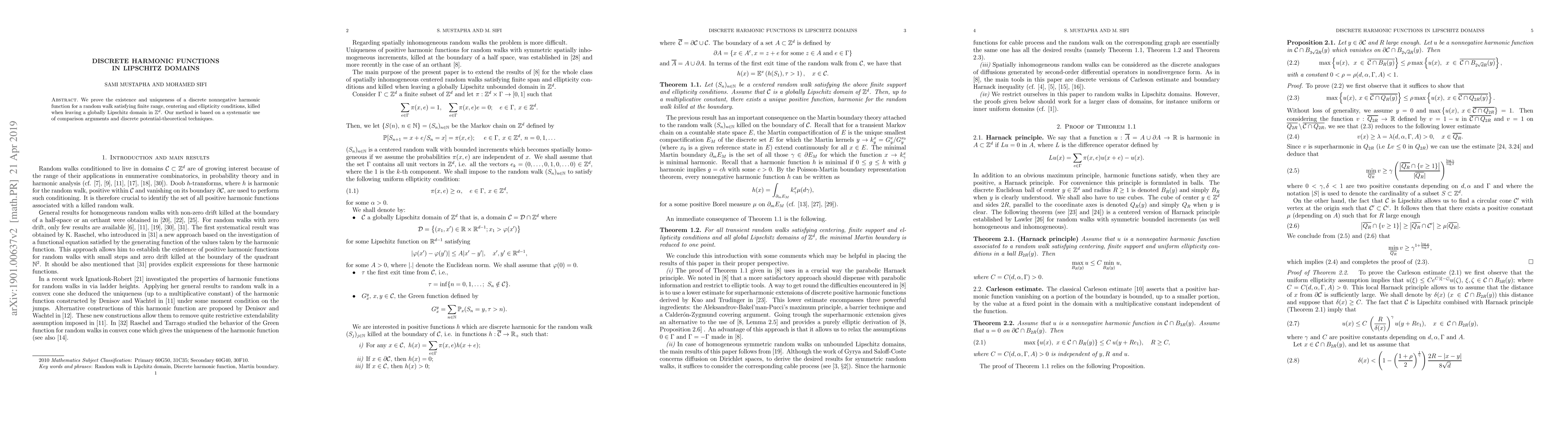 This paper proves the existence and uniqueness of a discrete nonnegative harmonic function for a random walk within certain conditions, using comparison arguments and potential-theoretical techniques.