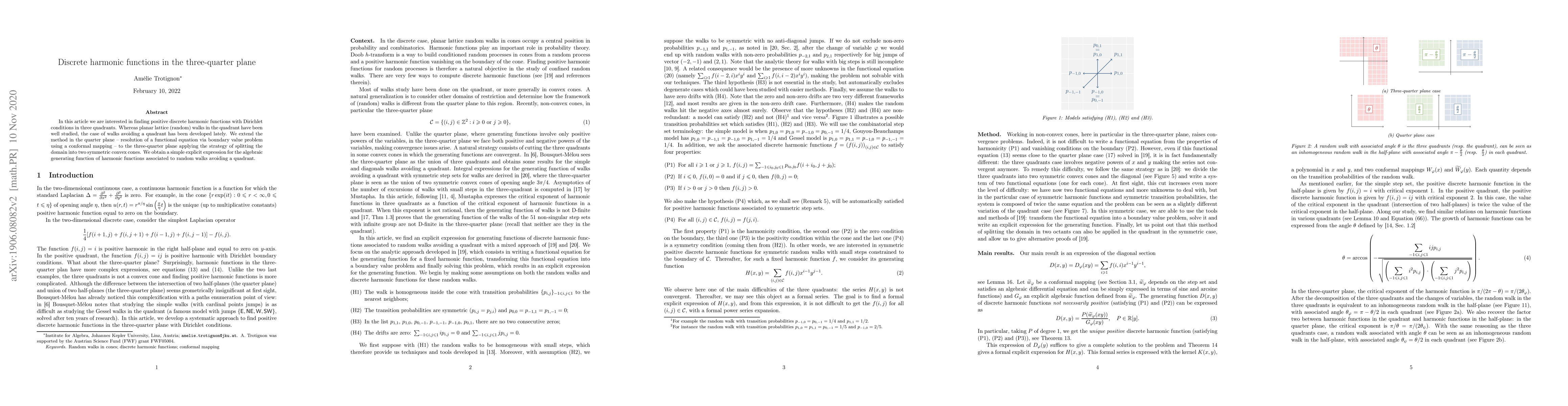 In this article we are interested in finding positive discrete harmonic functions with Dirichlet conditions in three quadrants. Whereas planar lattice (random) walks in the quadrant have been well studied, the case of walks avoiding a quadrant has been developed lately. We extend the method in the quarter plane -- resolution of a functional equation via boundary value problem using a conformal mapping -- to the three-quarter plane applying the strategy of splitting the domain into two symmetric convex cones. We obtain a simple explicit expression for the algebraic generating function of harmonic functions associated to random walks avoiding a quadrant.