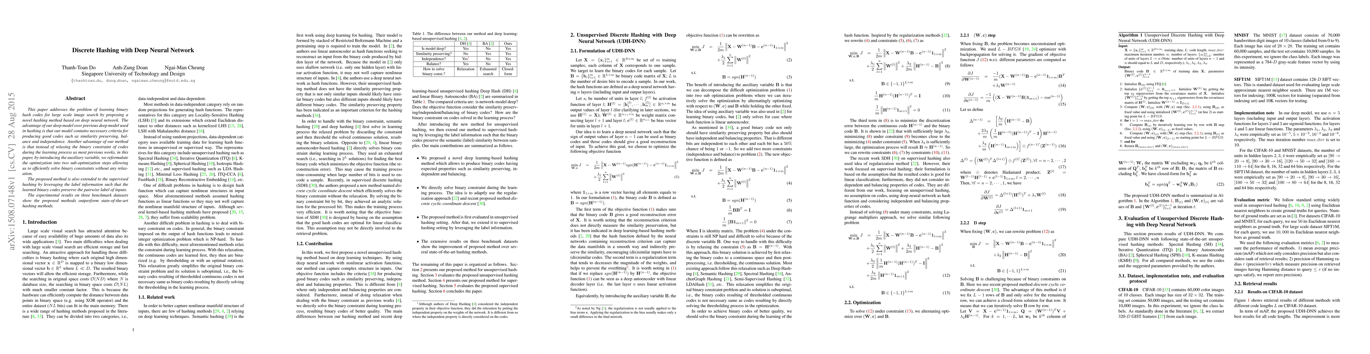 This paper addresses the problem of learning binary hash codes for large scale image search by proposing a novel hashing method based on deep neural network. The advantage of our deep model over previous deep model used in hashing is that our model contains necessary criteria for producing good codes such as similarity preserving, balance and independence. Another advantage of our method is that instead of relaxing the binary constraint of codes during the learning process as most previous works, in this paper, by introducing the auxiliary variable, we reformulate the optimization into two sub-optimization steps allowing us to efficiently solve binary constraints without any relaxation. The proposed method is also extended to the supervised hashing by leveraging the label information such that the learned binary codes preserve the pairwise label of inputs. The experimental results on three benchmark datasets show the proposed methods outperform state-of-the-art hashing methods.