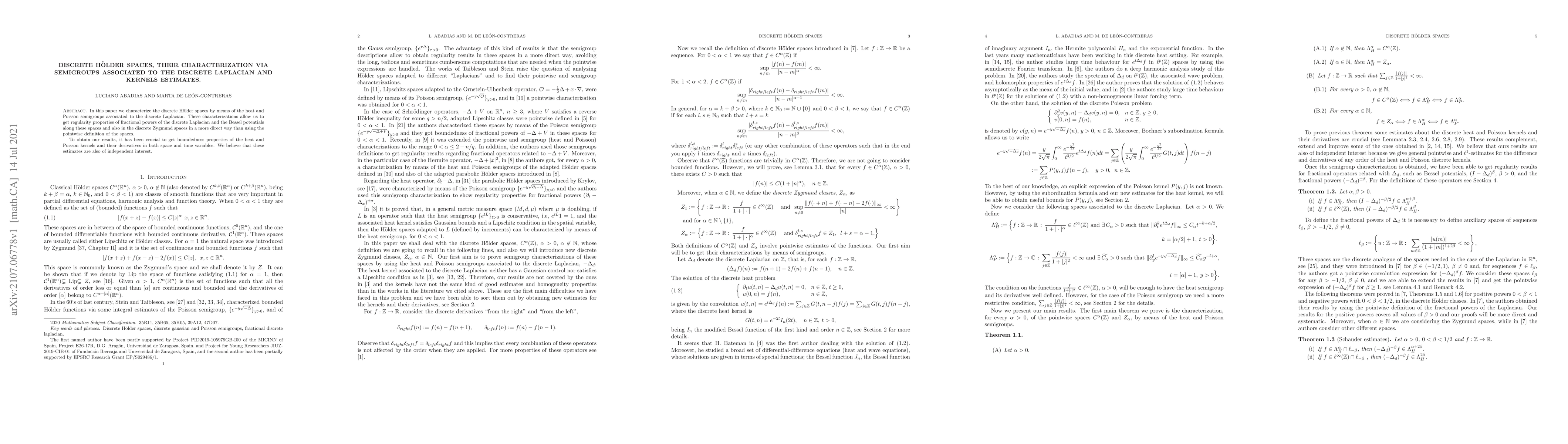 This paper characterizes discrete H\"older spaces using heat and Poisson semigroups linked to the discrete Laplacian, providing a more direct route to regularity properties of fractional powers of the discrete Laplacian and Bessel potentials. Key to the results are boundedness estimates for the heat and Poisson kernels and their derivatives.