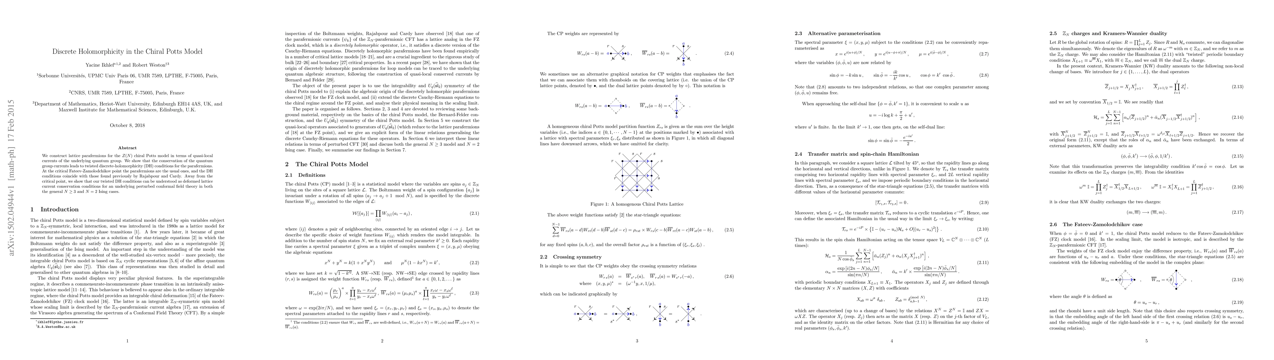 This paper constructs lattice parafermions for the $Z(N)$ chiral Potts model using quasi-local currents, demonstrating that their conservation leads to twisted discrete-holomorphicity conditions. At the critical Fateev-Zamolodchikov point, these conditions match previous findings, while away from the critical point, they relate to deformed lattice current conservation in perturbed conformal field theories.