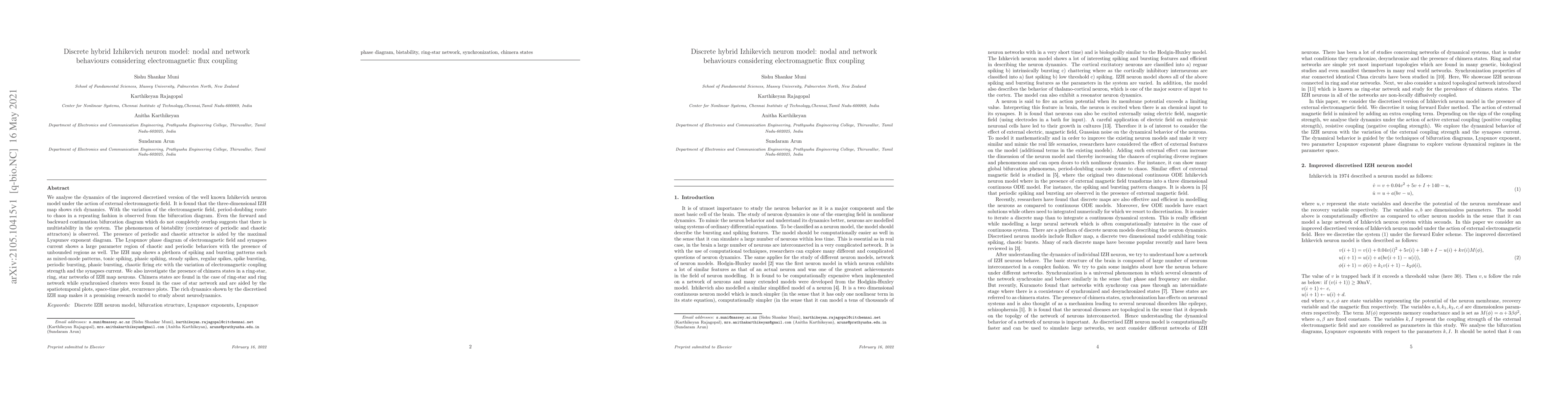 We analyse the dynamics of the improved discretised version of the well known Izhikevich neuronmodel under the action of external electromagnetic field. It is found that the three-dimensional IZHmap shows rich dynamics. With the variation of the electromagnetic field, period-doubling routeto chaos in a repeating fashion is observed from the bifurcation diagram. Even the forward andbackward continuation bifurcation diagram which do not completely overlap suggests that there is multistability in the system. The phenomenon of bistability (coexistence of periodic and chaotic attractors) is observed. The presence of periodic and chaotic attractor is aided by the maximal Lyapunov exponent diagram. The Lyapunov phase diagram of electromagnetic field and synapses current shows a large parameter region of chaotic and periodic behaviors with the presence of unbounded regions as well. The IZH map shows a plethora of spiking and bursting patterns such as mixed-mode patterns, tonic spiking, phasic spiking, steady spikes, regular spikes, spike bursting, periodic bursting, phasic bursting, chaotic firing, etc with the variation of electromagnetic coupling strength and the synapses current. We also investigate the presence of chimera states in a ring-star, ring, star network of IZH map neurons. Chimera states are found in the case of ring-star and ring network while synchronised clusters were found in the case of star network and are aided by the spatiotemporal plots, space-time plot, recurrence plots. The rich dynamics shown by the discretised IZH map makes it a promising research model to study about neurodynamics.