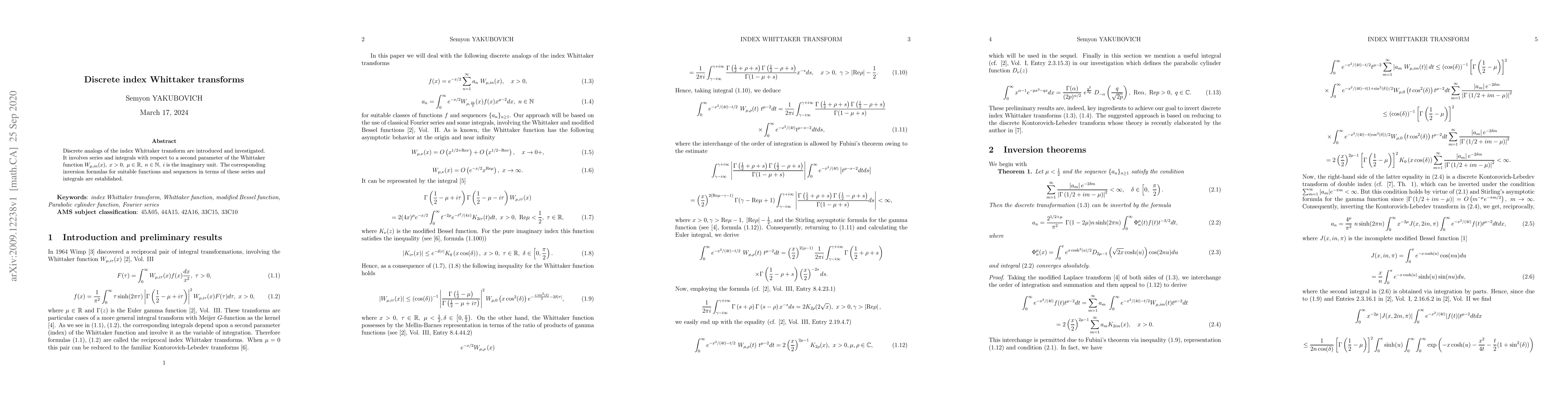 The research introduces discrete analogs of the index Whittaker transform, involving series and integrals with respect to a second parameter of the Whittaker function.