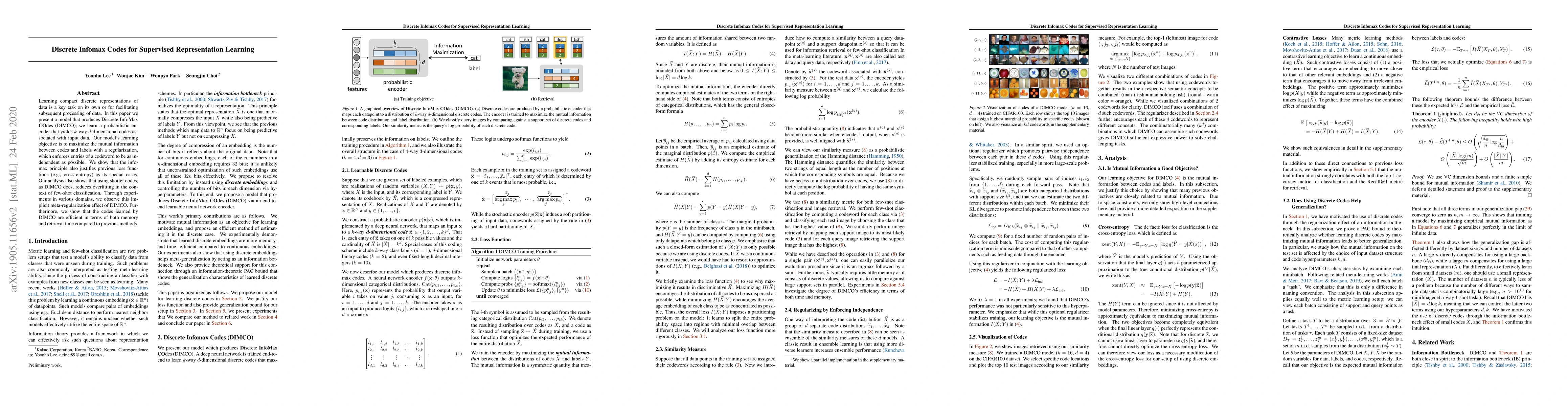 This paper introduces Discrete InfoMax Codes (DIMCO) for supervised representation learning, employing a probabilistic encoder to generate compact k-way d-dimensional codes. The model aims to maximize mutual information between codes and labels, enforcing codeword independence, and demonstrates reduced overfitting in few-shot classification scenarios.