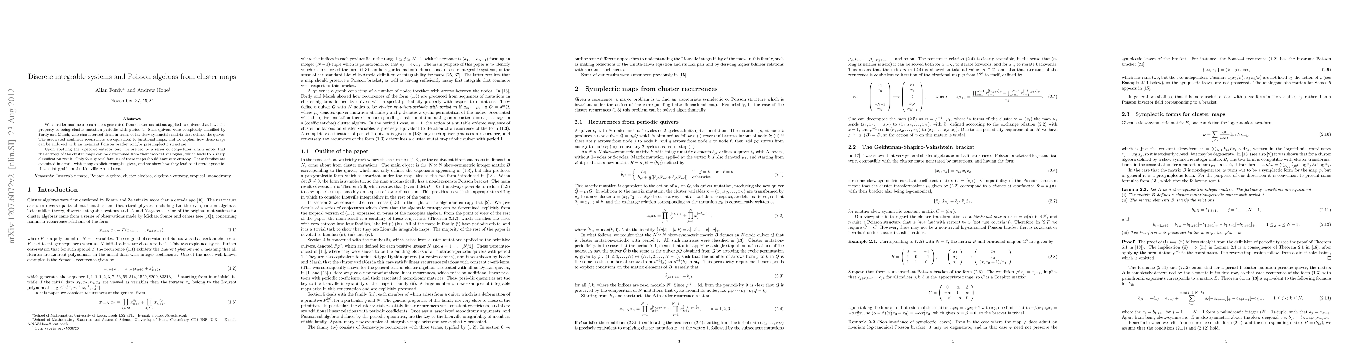 This paper explores nonlinear recurrences derived from cluster mutations on cluster mutation-periodic quivers, establishing their equivalence to birational maps with invariant Poisson brackets. It conjectures that the entropy of these maps can be inferred from their tropical analogues, leading to a classification of four special families with zero entropy, which exhibit integrable discrete dynamics.
