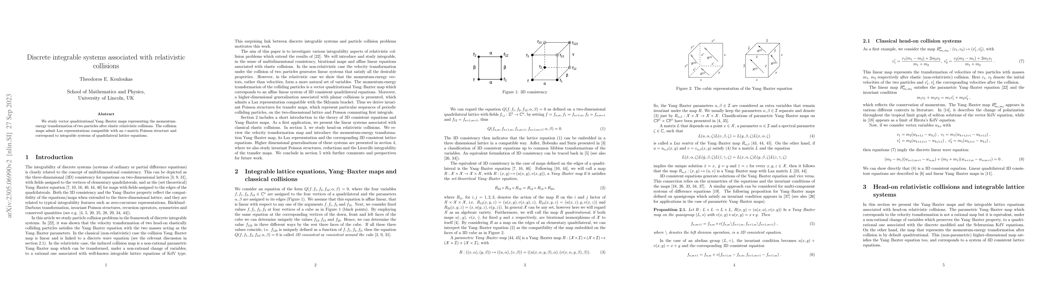 We study vector quadrirational Yang-Baxter maps representing the momentum-energy transformation of two particles after elastic relativistic collisions. The collision maps admit Lax representations compatible with an r-matrix Poisson structure and correspond to integrable systems of quadrilateral lattice equations.