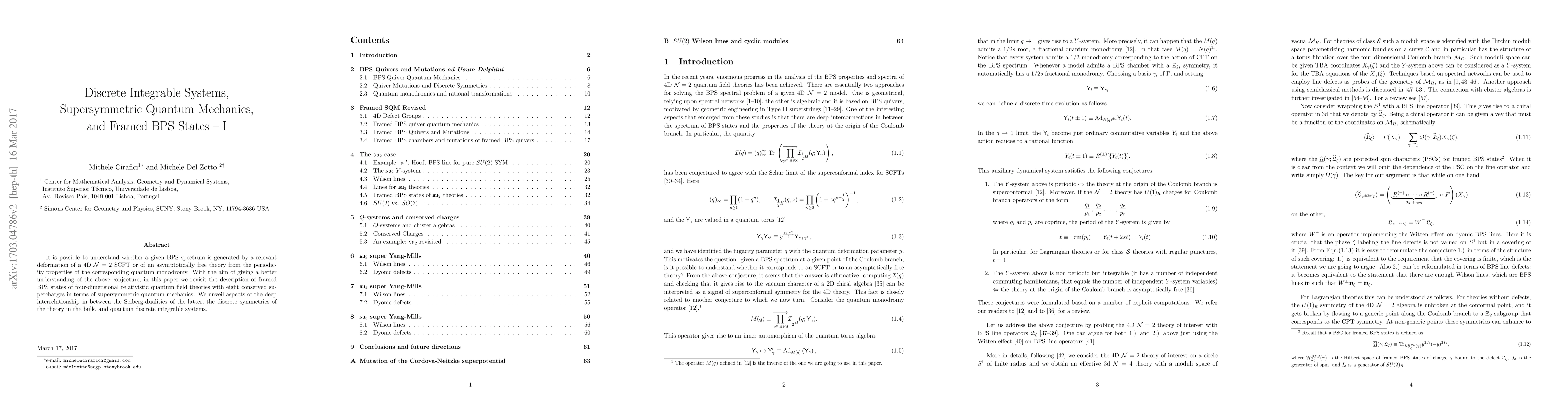 It is possible to understand whether a given BPS spectrum is generated by a relevant deformation of a 4D N=2 SCFT or of an asymptotically free theory from the periodicity properties of the corresponding quantum monodromy. With the aim of giving a better understanding of the above conjecture, in this paper we revisit the description of framed BPS states of four-dimensional relativistic quantum field theories with eight conserved supercharges in terms of supersymmetric quantum mechanics. We unveil aspects of the deep interrelationship in between the Seiberg-dualities of the latter, the discrete symmetries of the theory in the bulk, and quantum discrete integrable systems.