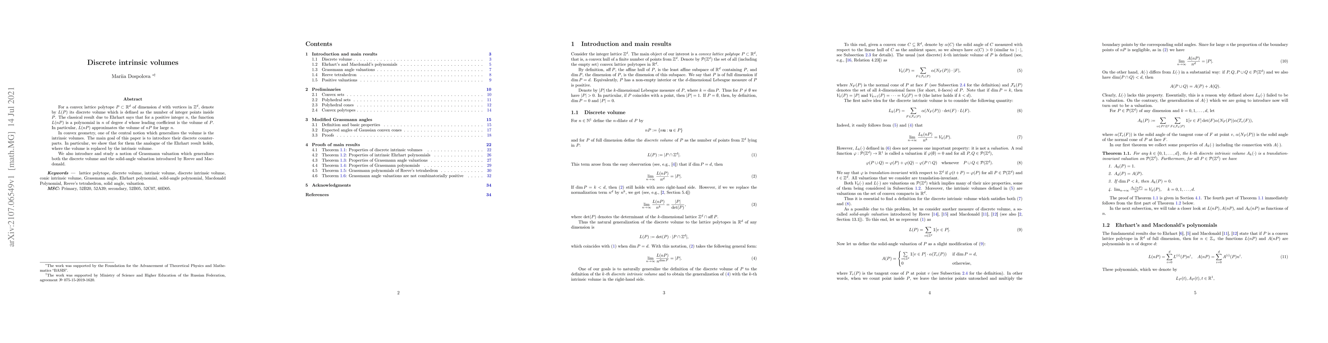 This paper introduces discrete intrinsic volumes for convex lattice polytopes, showing they behave like a polynomial in degree d with leading coefficient equal to the volume of the polytope, similar to Ehrhart's result.