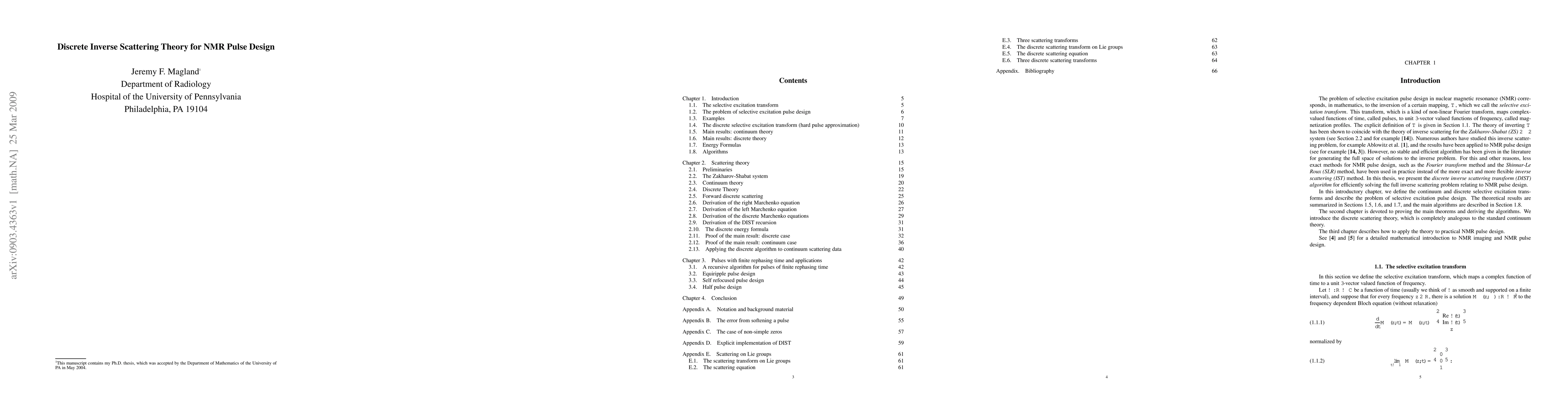 We introduce a discrete analogue of the scattering theory for the Zakharov-Shabat (ZS) system, and use it to continue the work of C.L. Epstein by deriving an efficient, recursive algorithm for generating RF-pulses for nuclear magnetic resonance (NMR). In the process, we present a straightforward derivation of the standard Gel'fand-Levitan-Marchenko (Marchenko) equations, and we derive similar equations which apply to the discrete framework. In addition, we prove that the potentials obtained by solving the Marchenko equations produce the correct scattering data. We explain how the generally accepted Shinnar-Le Roux (SLR) technique fits into the more general framework of discrete inverse scattering, and we show, using examples, how inverse scattering theory can be used to produce pulses which are, in some ways, superior to standard SLR pulses.