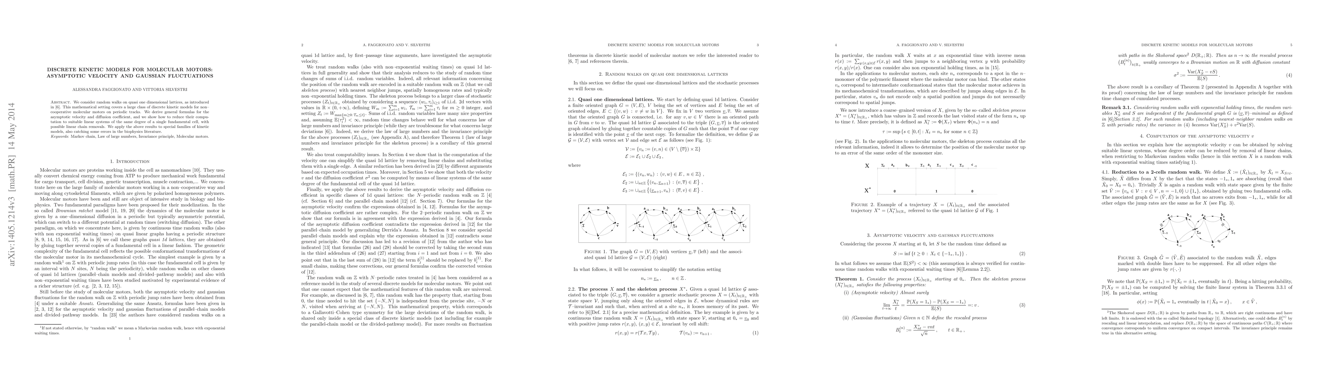 We consider random walks on quasi one dimensional lattices, as introduced in \cite{FS}. This mathematical setting covers a large class of discrete kinetic models for non-cooperative molecular motors on periodic tracks. We derive general formulas for the asymptotic velocity and diffusion coefficient, and we show how to reduce their computation to suitable linear systems of the same degree of a single fundamental cell, with possible linear chain removals. We apply the above results to special families of kinetic models, also catching some errors in the biophysics literature.