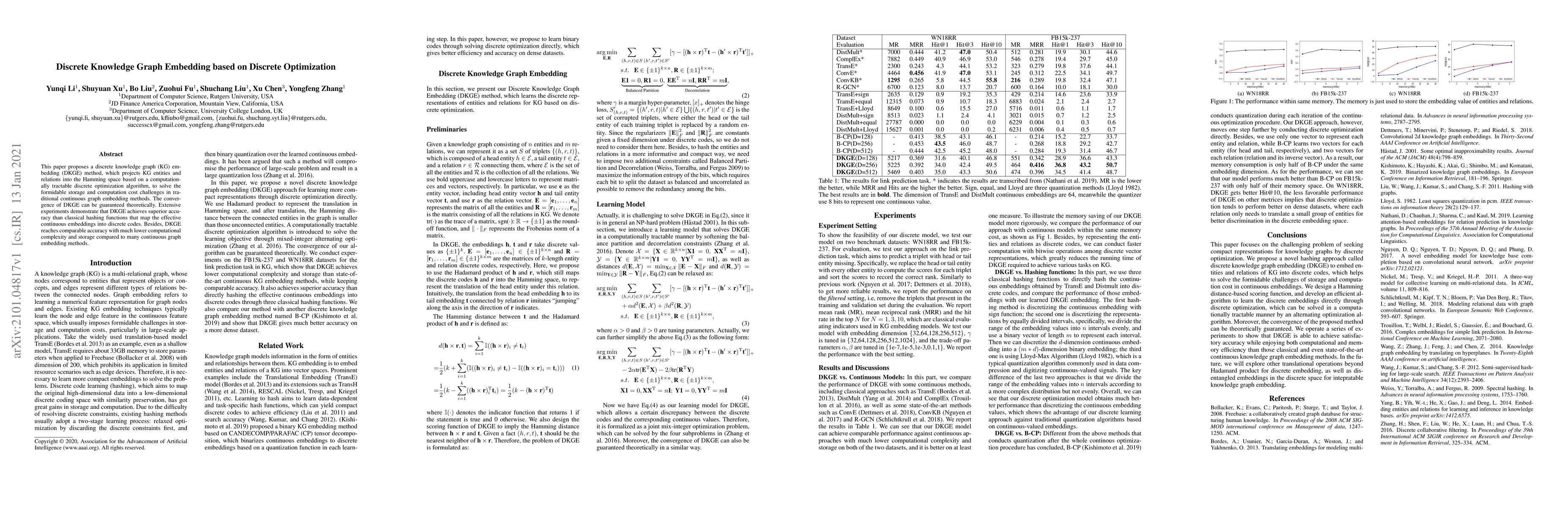 This paper introduces a discrete knowledge graph embedding method (DKGE) that uses discrete optimization to project entities and relations into the Hamming space, offering superior accuracy and lower computational complexity compared to traditional continuous methods. DKGE theoretically guarantees convergence and outperforms classical hashing functions in accuracy.