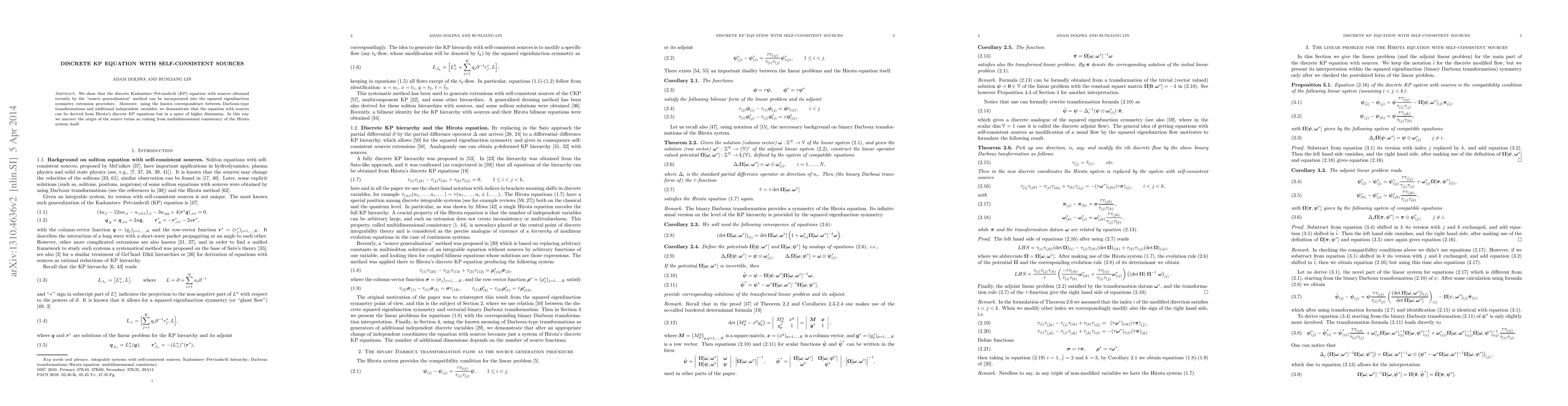 We show that the discrete Kadomtsev-Petviashvili (KP) equation with sources obtained recently by the "source generalization" method can be incorporated into the squared eigenfunction symmetry extension procedure. Moreover, using the known correspondence between Darboux-type transformations and additional independent variables, we demonstrate that the equation with sources can be derived from Hirota's discrete KP equations but in a space of higher dimension. In this way we uncover the origin of the source terms as coming from multidimensional consistency of the Hirota system itself.