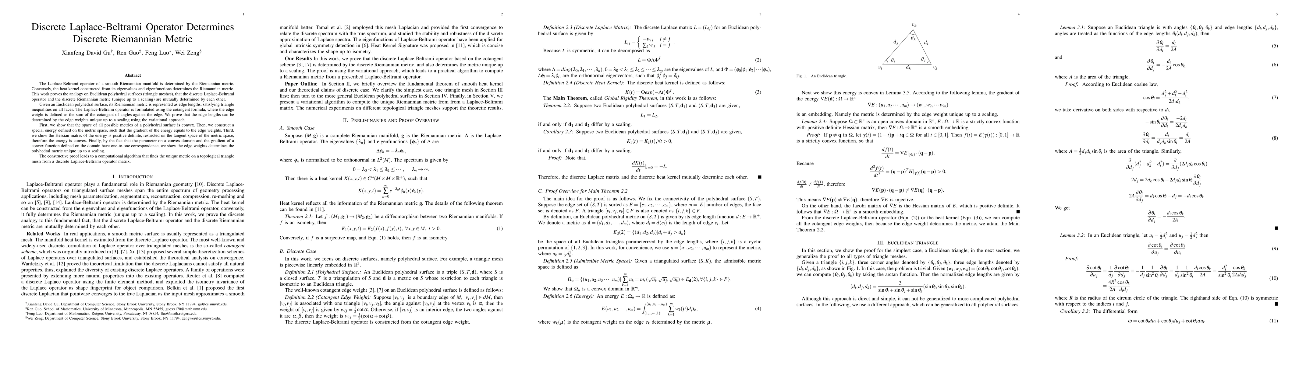 This paper demonstrates that the discrete Laplace-Beltrami operator on Euclidean polyhedral surfaces (triangle meshes) uniquely determines the discrete Riemannian metric up to a scaling. It constructs a special energy function whose gradient corresponds to the edge weights, proving the convexity of the metric space and establishing a one-to-one correspondence between edge weights and the metric.