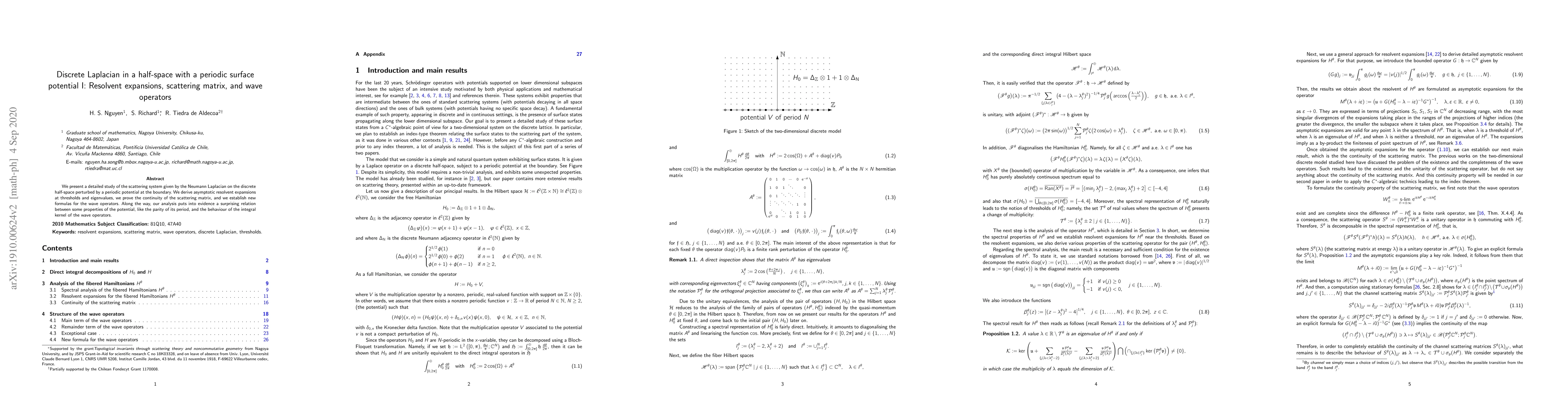 We present a detailed study of the scattering system given by the Neumann Laplacian on the discrete half-space perturbed by a periodic potential at the boundary. We derive asymptotic resolvent expansions at thresholds and eigenvalues, we prove the continuity of the scattering matrix, and we establish new formulas for the wave operators. Along the way, our analysis puts into evidence a surprising relation between some properties of the potential, like the parity of its period, and the behaviour of the integral kernel of the wave operators.