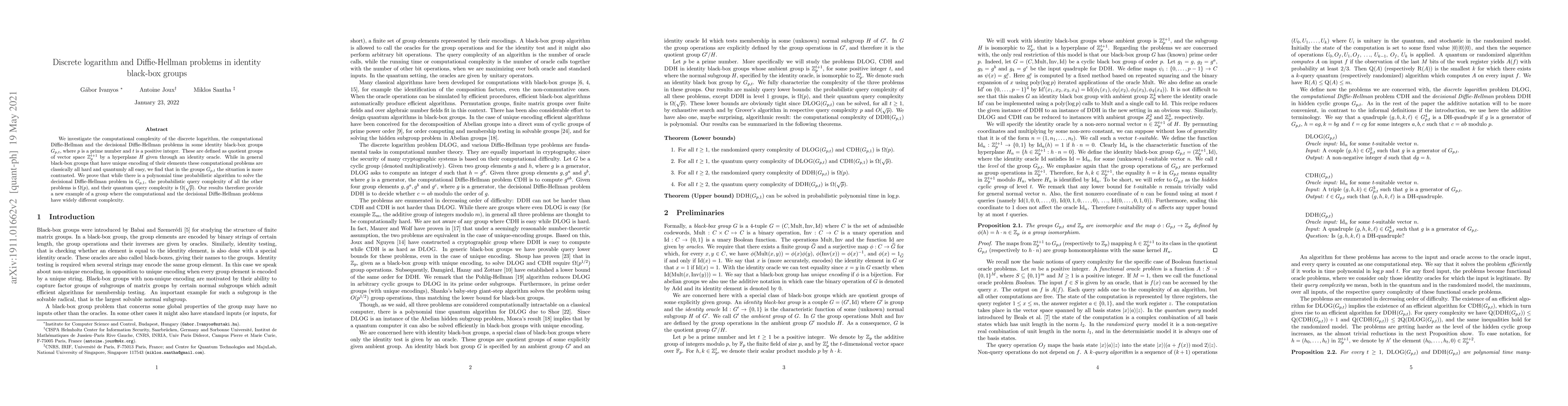This paper explores the computational complexity of discrete logarithm and Diffie-Hellman problems in identity black-box groups, finding that while the decisional Diffie-Hellman problem is solvable in polynomial time for $G_{p,1}$, other problems require Omega(p) queries, highlighting a contrast in complexity.