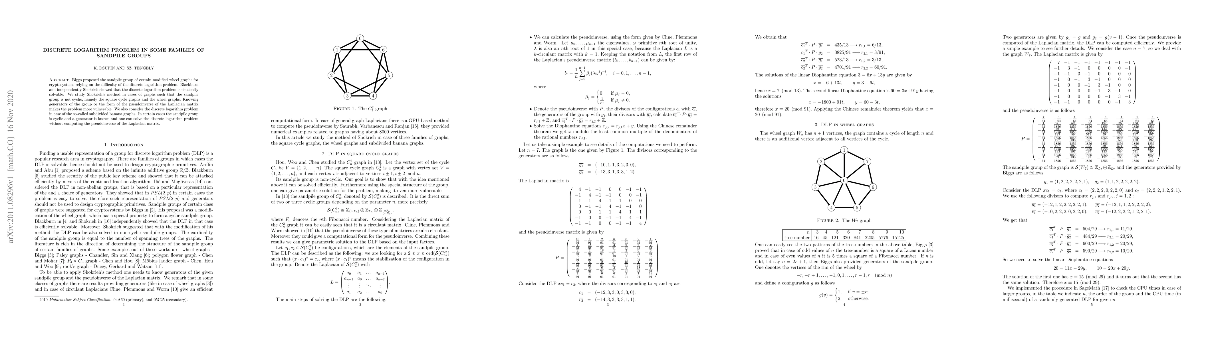 Biggs proposed the sandpile group of certain modified wheel graphs for cryptosystems relying on the difficulty of the discrete logarithm problem. Blackburn and independently Shokrieh showed that the discrete logarithm problem is efficiently solvable. We study Shokrieh's method in cases of graphs such that the sandpile group is not cyclic, namely the square cycle graphs and the wheel graphs. Knowing generators of the group or the form of the pseudoinverse of the Laplacian matrix makes the problem more vulnerable. We also consider the discrete logarithm problem in case of the so-called subdivided banana graphs. In certain cases the sandpile group is cyclic and a generator is known and one can solve the discrete logarithm problem without computing the pseudoinverse of the Laplacian matrix.