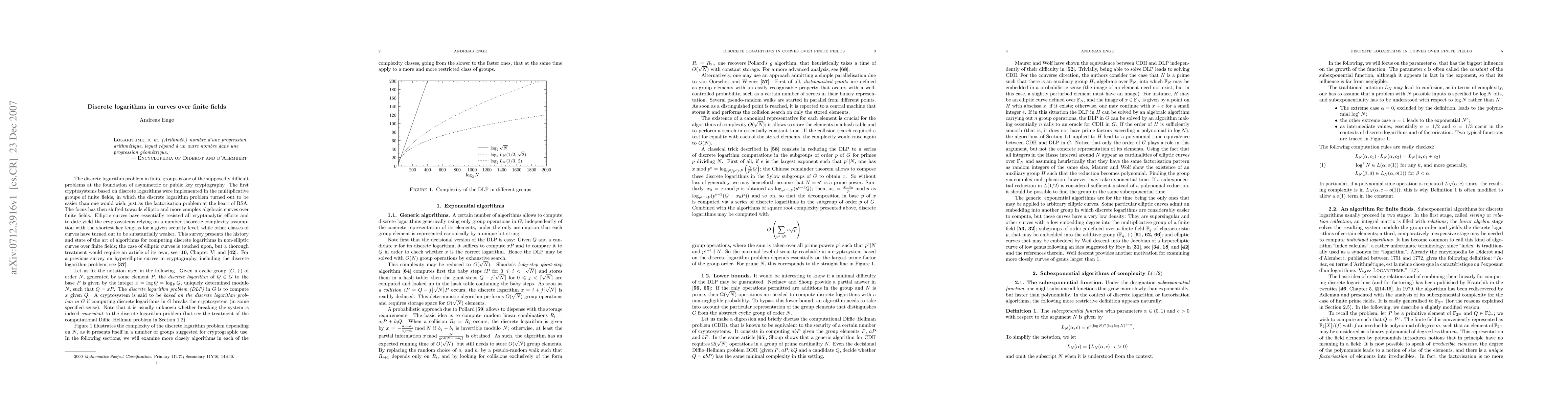 Summary: This paper surveys various algorithms designed for calculating discrete logarithms in Jacobians of curves defined over finite fields, discussing their efficiency and applications.