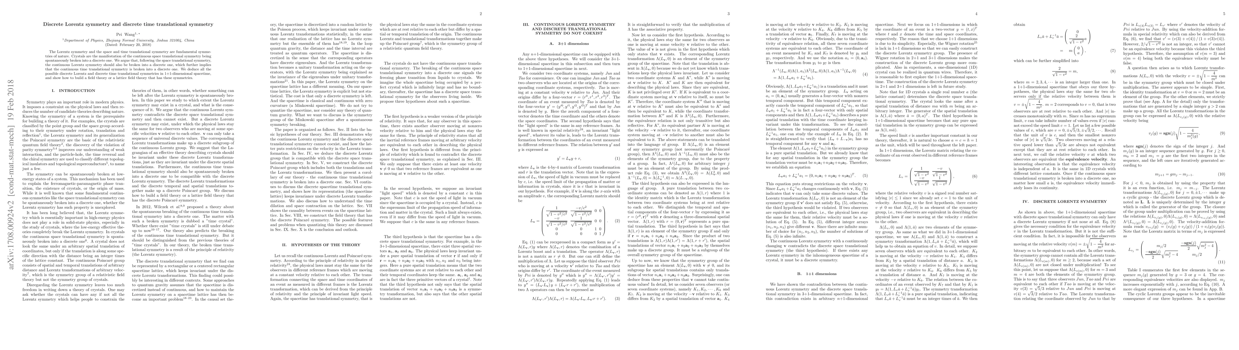 This paper argues that continuous Lorentz symmetry and time translational symmetry can be spontaneously broken into discrete forms, analogous to how continuous space translational symmetry is broken in crystals. The authors deduce all possible discrete symmetries in 1+1-dimensional spacetime and propose a method to construct field theories with these discrete symmetries.